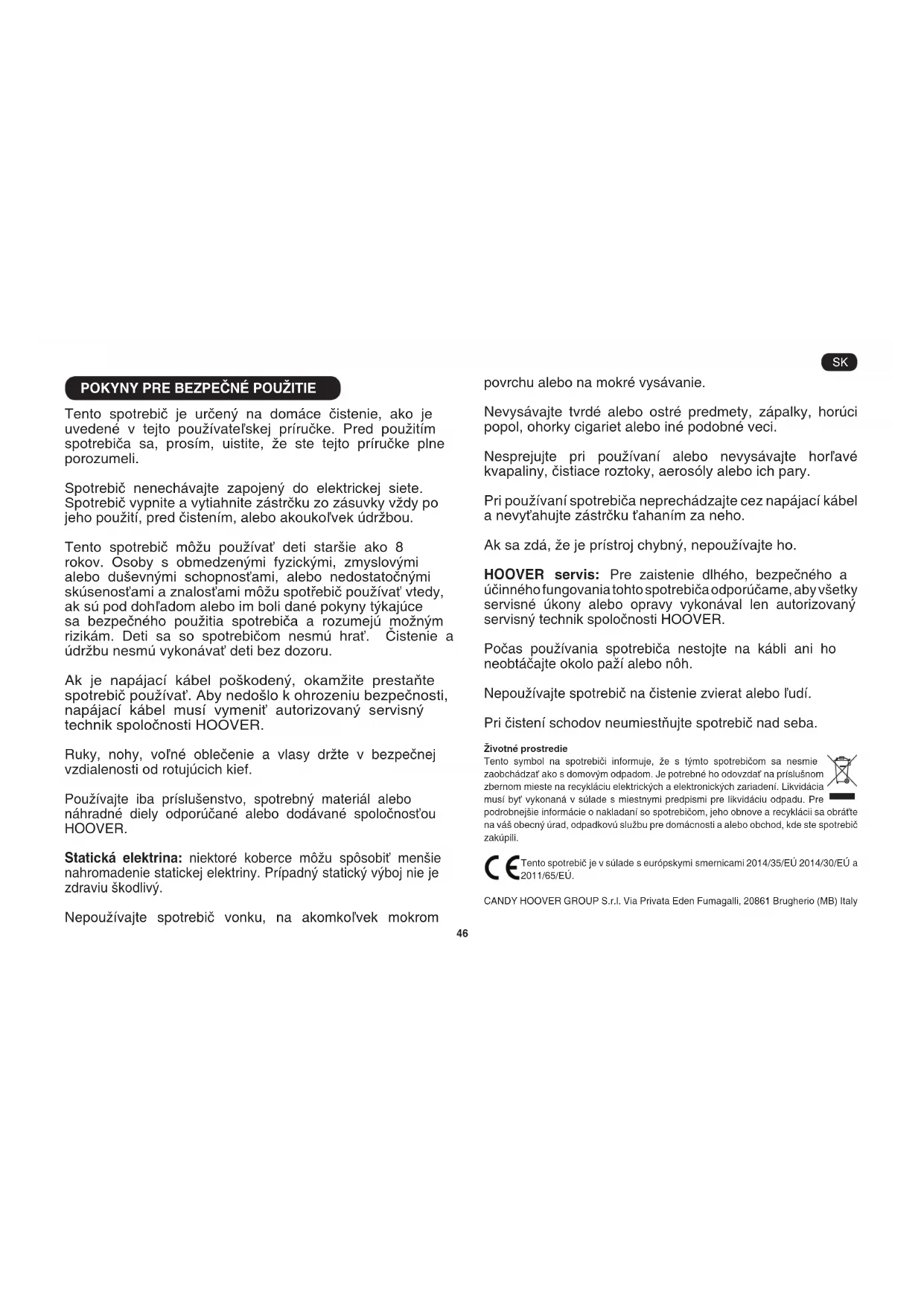 Tento spotrebič je určený na domáce čistenie, ako je uvedené v tejto používateľskej príručke. Pred použitím spotrebiča sa, prosím, uistite, že ste tejto príručke plne porozumeli. Spotrebič nenechávajte zapojený do elektrickej siete. Spotrebič vypnite a vytiahnite zástrčku zo zásuvky vždy po jeho použití, pred čistením, alebo akoukoľvek údržbou. Tento spotrebič môžu používať deti staršie ako 8 rokov. Osoby s obmedzenými fyzickými, zmyslovými alebo duševnými schopnosťami, alebo nedostatočnými skúsenosťami a znalosťami môžu spotřebič používať vtedy, ak sú pod dohľadom alebo im boli dané pokyny týkajúce sa bezpečného použitia spotrebiča a rozumejú možným rizikám. Deti sa so spotrebičom nesmú hrať. Čistenie a údržbu nesmú vykonávať deti bez dozoru. Ak je napájací kábel poškodený, okamžite prestaňte spotrebič používať. Aby nedošlo k ohrozeniu bezpečnosti, napájací kábel musí vymeniť autorizovaný servisný technik spoločnosti HOOVER. Ruky, nohy, voľné oblečenie a vlasy držte v bezpečnej vzdialenosti od rotujúcich kief. Používajte iba príslušenstvo, spotrebný materiál alebo náhradné diely odporúčané alebo dodávané spoločnosťou HOOVER. Statická elektrina: niektoré koberce môžu spôsobiť menšie nahromadenie statickej elektriny. Prípadný statický výboj nie je zdraviu škodlivý. Nepoužívajte spotrebič vonku, na akomkoľvek mokrom povrchu alebo na mokré vysávanie. Nevysávajte tvrdé alebo ostré predmety, zápalky, horúci popol, ohorky cigariet alebo iné podobné veci. Nesprejujte pri používaní alebo nevysávajte horľavé kvapaliny, čistiace roztoky, aerosóly alebo ich pary. Pri používaní spotrebiča neprechádzajte cez napájací kábel a nevyťahujte zástrčku ťahaním za neho. Ak sa zdá, že je prístroj chybný, nepoužívajte ho. HOOVER servis: Pre zaistenie dlhého, bezpečného a účinného fungovania tohto spotrebiča odporúčame, aby všetky servisné úkony alebo opravy vykonával len autorizovaný servisný technik spoločnosti HOOVER. Počas používania spotrebiča nestojte na kábli ani ho neobtáčajte okolo paží alebo nôh. Nepoužívajte spotrebič na čistenie zvierat alebo ľudí. Pri čistení schodov neumiestňujte spotrebič nad seba. Životné prostredie Tento symbol na spotrebiči informuje, že s týmto spotrebičom sa nesmie zaobchádzať ako s domovým odpadom. Je potrebné ho odovzdať na príslušnom zbernom mieste na recykláciu elektrických a elektronických zariadení. Likvidácia musí byť vykonaná v súlade s miestnymi predpismi pre likvidáciu odpadu. Pre podrobnejšie informácie o nakladaní so spotrebičom, jeho obnove a recyklácii sa obráťte na váš obecný úrad, odpadkovú službu pre domácnosti a alebo obchod, kde ste spotrebič zakúpili. Tento spotrebič je v súlade s európskymi smernicami 2014/35/EÚ 2014/30/EÚ a 2011/65/EÚ. CANDY HOOVER GROUP S.r.l. Via Privata Eden Fumagalli, 20861 Brugherio (MB) Italy SK47 *Iba u niektorých modelov **Vzhľad hubice sa môže líšiť v závislosti od modelu