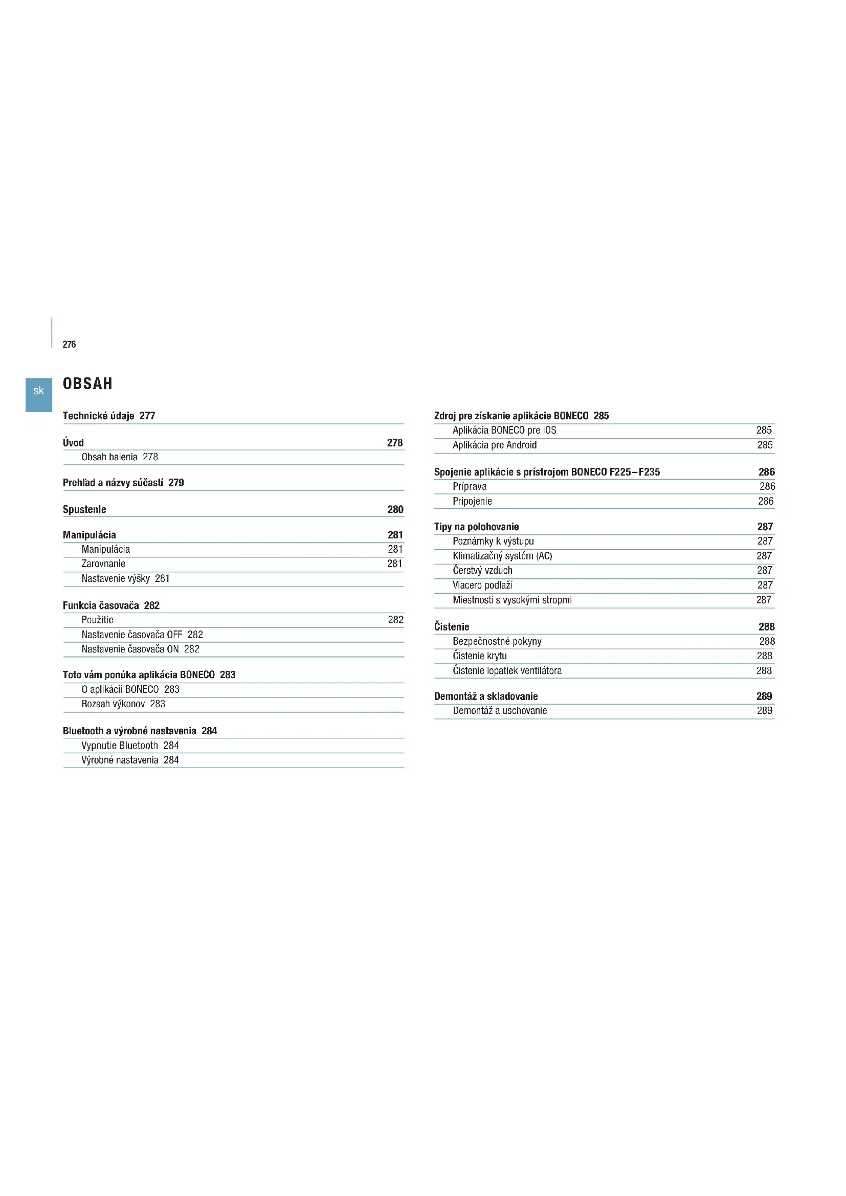 OBSAH Technické údaje 277 Úvod 278 Obsah balenia 278 Prehľad anázvy súčastí 279 Spustenie 280 Manipulácia 281 Manipulácia 281 Zarovnanie 281 Nastavenie výšky 281 Funkcia časovača 282 Použitie 282 Nastavenie časovača OFF 282 Nastavenie časovača ON 282 Toto vám ponúka aplikácia BONECO 283 Oaplikácii BONECO 283 Rozsah výkonov 283 Bluetooth a výrobné nastavenia 284 Vypnutie Bluetooth 284 Výrobné nastavenia 284 Zdroj pre získanie aplikácie BONECO 285 Aplikácia BONECO pre iOS 285 Aplikácia pre Android 285 Spojenie aplikácie sprístrojom BONECO F225 – F235 286 Príprava 286 Pripojenie 286 Tipy na polohovanie 287 Poznámky kvýstupu 287 Klimatizačný systém (AC) 287 Čerstvý vzduch 287 Viacero podlaží 287 Miestnosti svysokými stropmi 287 Čistenie 288 Bezpečnostné pokyny 288 Čistenie krytu 288 Čistenie lopatiek ventilátora 288 Demontáž askladovanie 289 Demontáž a uschovanie 289277