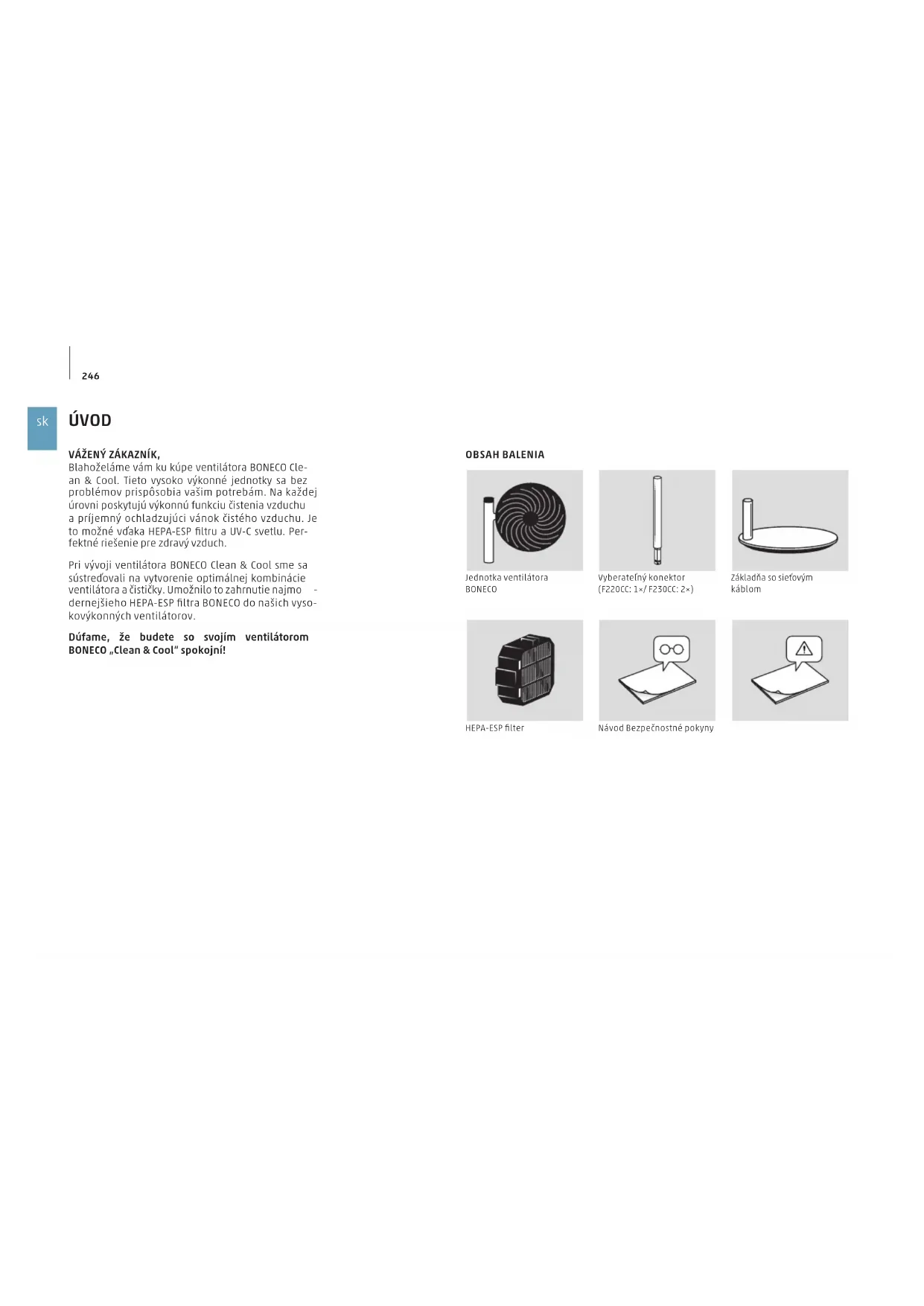 ÚVOD OBSAH BALENIA Jednotka ventilátora BONECO Vyberateľný konektor (F220CC: 1×/ F230CC: 2×) Základňa so sieťovým káblom Návod Bezpečnostné pokyny VÁŽENÝ ZÁKAZNÍK, Blahoželáme vám ku kúpe ventilátora BONECO Cle- an & Cool. Tieto vysoko výkonné jednotky sa bez problémov prispôsobia vašim potrebám. Na každej úrovni poskytujú výkonnú funkciu čistenia vzduchu a príjemný ochladzujúci vánok čistého vzduchu. Je to možné vďaka HEPA-ESP filtru a UV-C svetlu. Per- fektné riešenie pre zdravý vzduch. Pri vývoji ventilátora BONECO Clean & Cool sme sa sústreďovali na vytvorenie optimálnej kombinácie ventilátora a čističky. Umožnilo to zahrnutie najmo