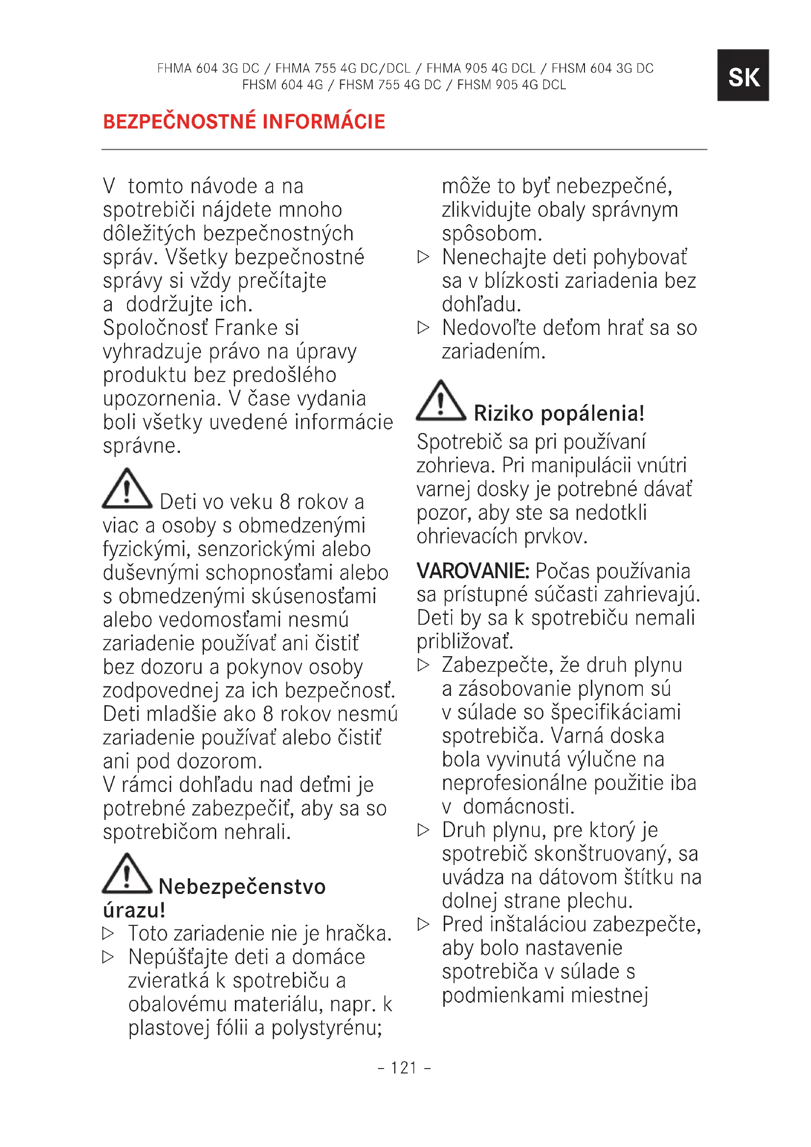 Zabezpečte, aby bola kuchyňa dobre vetraná, najmä keď sa spotrebič používa. Nechajte otvorené prirodzené vetracie otvory alebo nainštalujte mechanické vetracie zariadenie (digestor).– 123 – FHMA 604 3G DC / FHMA 755 4G DC/DCL / FHMA 905 4G DCL / FHSM 604 3G DC FHSM 604 4G / FHSM 755 4G DC / FHSM 905 4G DCL