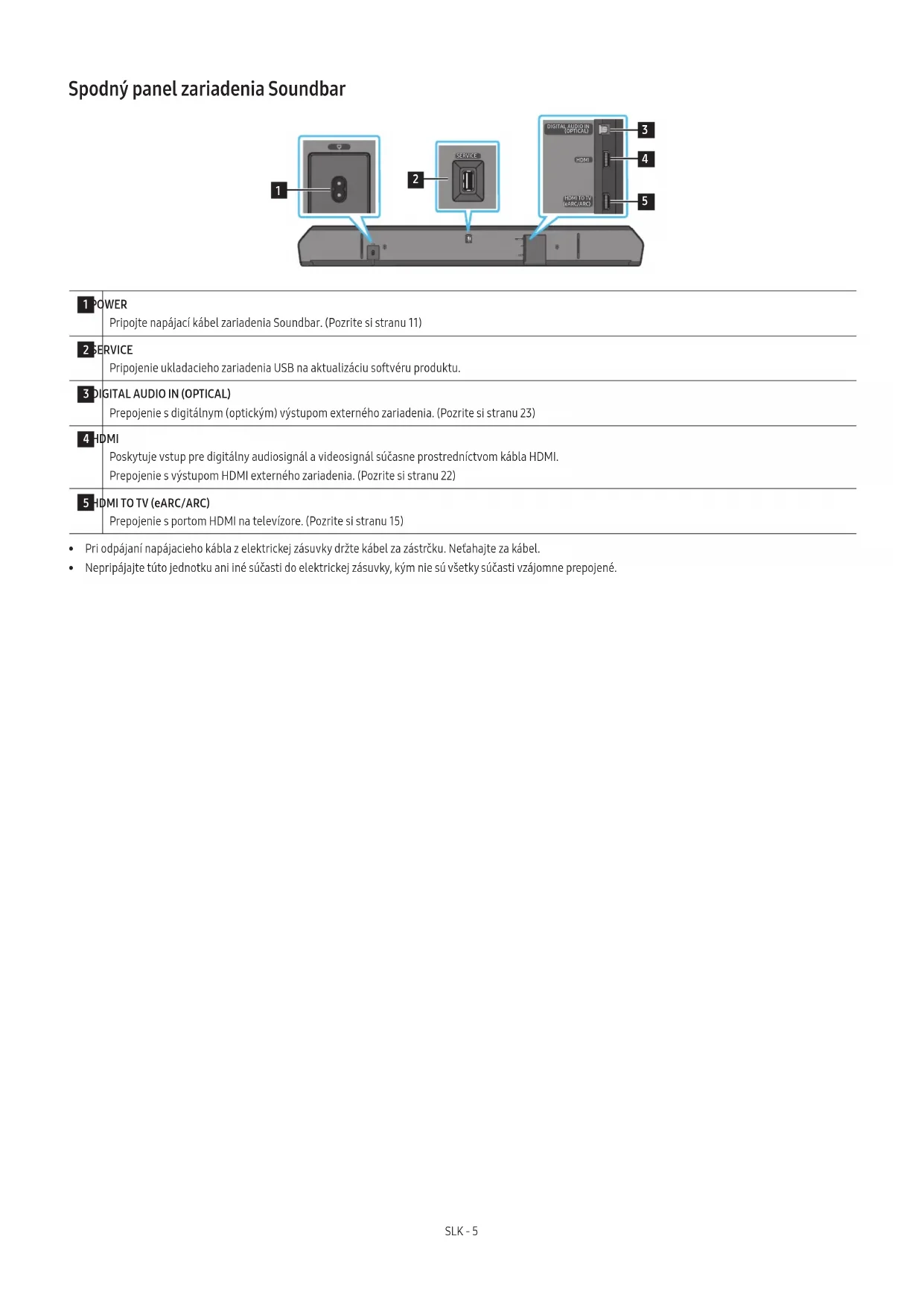 1 POWER Pripojte napájací kábel zariadenia Soundbar. (Pozrite si stranu 11) 2 SERVICE Pripojenie ukladacieho zariadenia USB na aktualizáciu softvéru produktu. 3 DIGITAL AUDIO IN (OPTICAL) Prepojenie s digitálnym (optickým) výstupom externého zariadenia. (Pozrite si stranu 23) 4 HDMI Poskytuje vstup pre digitálny audiosignál a videosignál súčasne prostredníctvom kábla HDMI. Prepojenie s výstupom HDMI externého zariadenia. (Pozrite si stranu 22) 5 HDMI TO TV (eARC/ARC) Prepojenie s portom HDMI na televízore. (Pozrite si stranu 15)