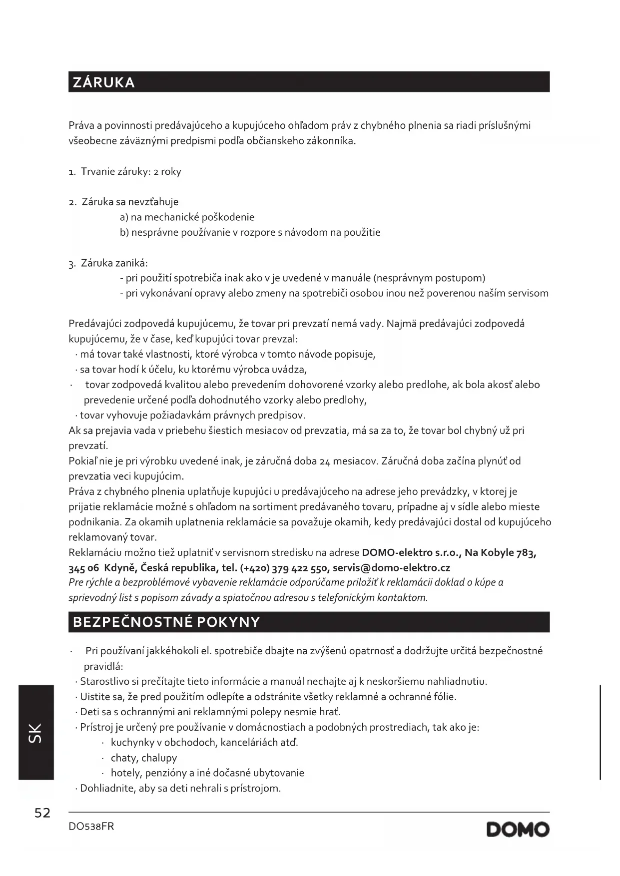 - tovar vyhovuje požiadavkám právnych predpisov. Ak sa prejavia vada v priebehu šiestich mesiacov od prevzatia, má sa za to, že tovar bol chybný už pri prevzatí. Pokiaľ nie je pri výrobku uvedené inak, je záručná doba 24 mesiacov. Záručná doba začína plynúť od prevzatia veci kupujúcim. Práva z chybného plnenia uplatňuje kupujúci u predávajúceho na adrese jeho prevádzky, v ktorej je prijatie reklamácie možné s ohľadom na sortiment predávaného tovaru, prípadne aj v sídle alebo mieste podnikania. Za okamih uplatnenia reklamácie sa považuje okamih, kedy predávajúci dostal od kupujúceho reklamovaný tovar. Reklamáciu možno tiež uplatniť v servisnom stredisku na adrese DOMO-elektro s.r.o., Na Kobyle 783, 345 06 Kdyně, Česká republika, tel. (+420) 379 422 550, servis@domo-elektro.cz Pre rýchle a bezproblémové vybavenie reklamácie odporúčame priložiť k reklamácii doklad o kúpe a sprievodný list s popisom závady a spiatočnou adresou s telefonickým kontaktom.