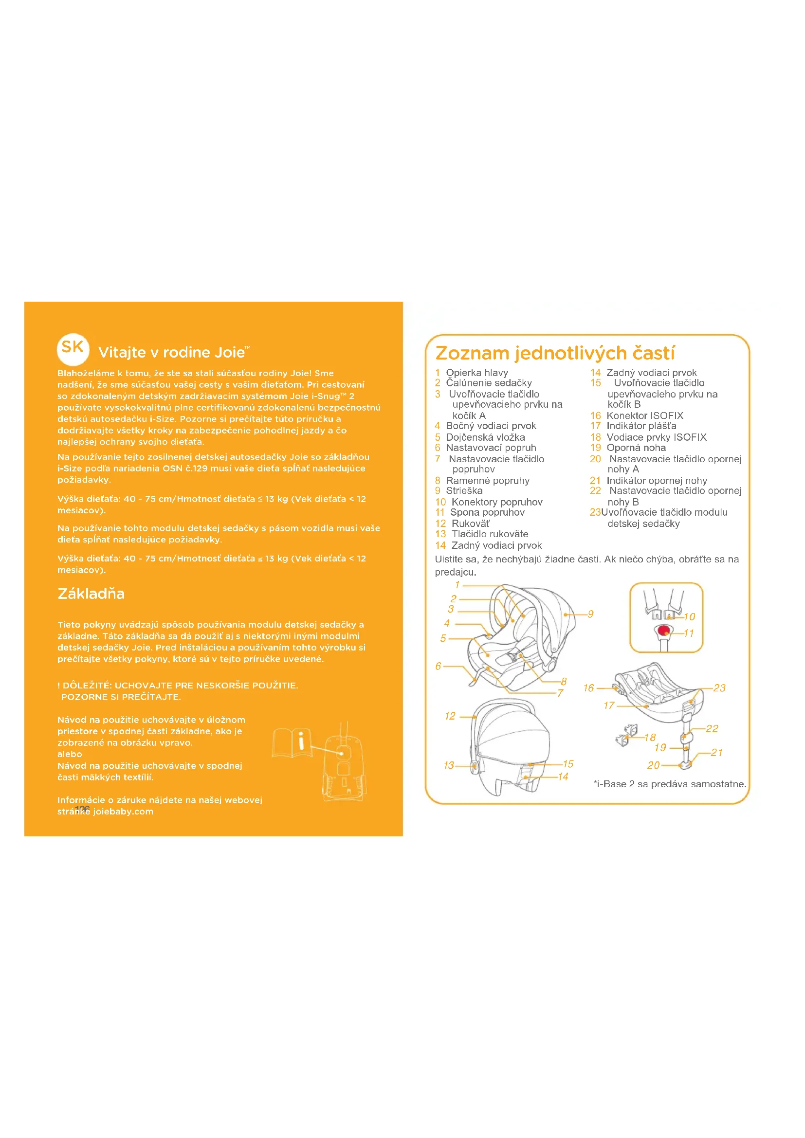Blahoželáme k tomu, že ste sa stali súčasťou rodiny Joie! Sme nadšení, že sme súčasťou vašej cesty s vašim dieťaťom. Pri cestovaní so zdokonaleným detským zadržiavacím systémom Joie i-Snug™ 2 používate vysokokvalitnú plne certifikovanú zdokonalenú bezpečnostnú detskú autosedačku i-Size. Pozorne si prečítajte túto príručku a dodržiavajte všetky kroky na zabezpečenie pohodlnej jazdy a čo najlepšej ochrany svojho dieťaťa.Na používanie tejto zosilnenej detskej autosedačky Joie so základňou i-Size podľa nariadenia OSN č.129 musí vaše dieťa spĺňať nasledujúce požiadavky.Výška dieťaťa: 40 - 75 cm/Hmotnosť dieťaťa ≤ 13 kg (Vek dieťaťa < 12 mesiacov).Na používanie tohto modulu detskej sedačky s pásom vozidla musí vaše dieťa spĺňať nasledujúce požiadavky.Výška dieťaťa: 40 - 75 cm/Hmotnosť dieťaťa ≤ 13 kg (Vek dieťaťa < 12 mesiacov). Základňa Tieto pokyny uvádzajú spôsob používania modulu detskej sedačky a základne. Táto základňa sa dá použiť aj s niektorými inými modulmi detskej sedačky Joie. Pred inštaláciou a používaním tohto výrobku si prečítajte všetky pokyny, ktoré sú v tejto príručke uvedené.! DÔLEŽITÉ: UCHOVAJTE PRE NESKORŠIE POUŽITIE.POZORNE SI PREČÍTAJTE.Návod na použitie uchovávajte v úložnom priestore v spodnej časti základne, ako je zobrazené na obrázku vpravo.aleboNávod na použitie uchovávajte v spodnej časti mäkkých textílií.Informácie o záruke nájdete na našej webovej stránke joiebaby.com