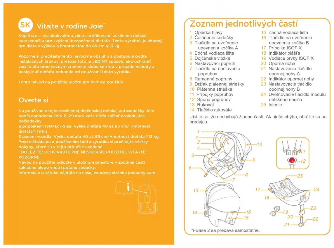 Kúpili ste si vysokokvalitnú﹐ plne certifikovanú zosilnenú detskú autosedačku pre zvýšenú bezpečnosť dieťaťa. Tento výrobok je vhodný pre dieťa s výškou a hmotnosťou do 85 cm a 13 kg.Pozorne si prečítajte tento návod na obsluhu a postupuje podľa inštalačných krokov﹐ pretože toto je JEDINÝ spôsob﹐ ako ochrániť vaše dieťa pred vážnym zranením alebo smrťou v prípade nehody a poskytnúť dieťaťu pohodlie pri používaní tohto výrobku.Tento návod na použitie uložte pre budúce použitie. Overte si Na používanie tejto zosilnenej dojčenskej detskej autosedačky Joie podľa nariadenia OSN č.129 musí vaše dieťa spĺňať nasledujúce požiadavky.S prípojkami ISOFIX i-Size: Výška dieťaťa 40 až 85 cm/ Hmotnosť dieťaťa 13 kgS pásom vozidla: Výška dieťaťa 40 až 85 cm/Hmotnosť dieťaťa 13 kg.Pred inštaláciou a používaním tohto výrobku si prečítajte všetky pokyny﹐ ktoré sú v tejto príručke uvedené.! DÔLEŽITÉ: UCHOVAJTE PRE NESKORŠIE POUŽITIE. ČÍTAJTE POZORNE.Návod na použitie odložte v úložnom priestore v spodnej časti základne alebo vnútri poťahu sedačky.Informácie o záruke nájdete na našej webovej stránke joiebaby.com *i-Base 2 sa predáva samostatne.