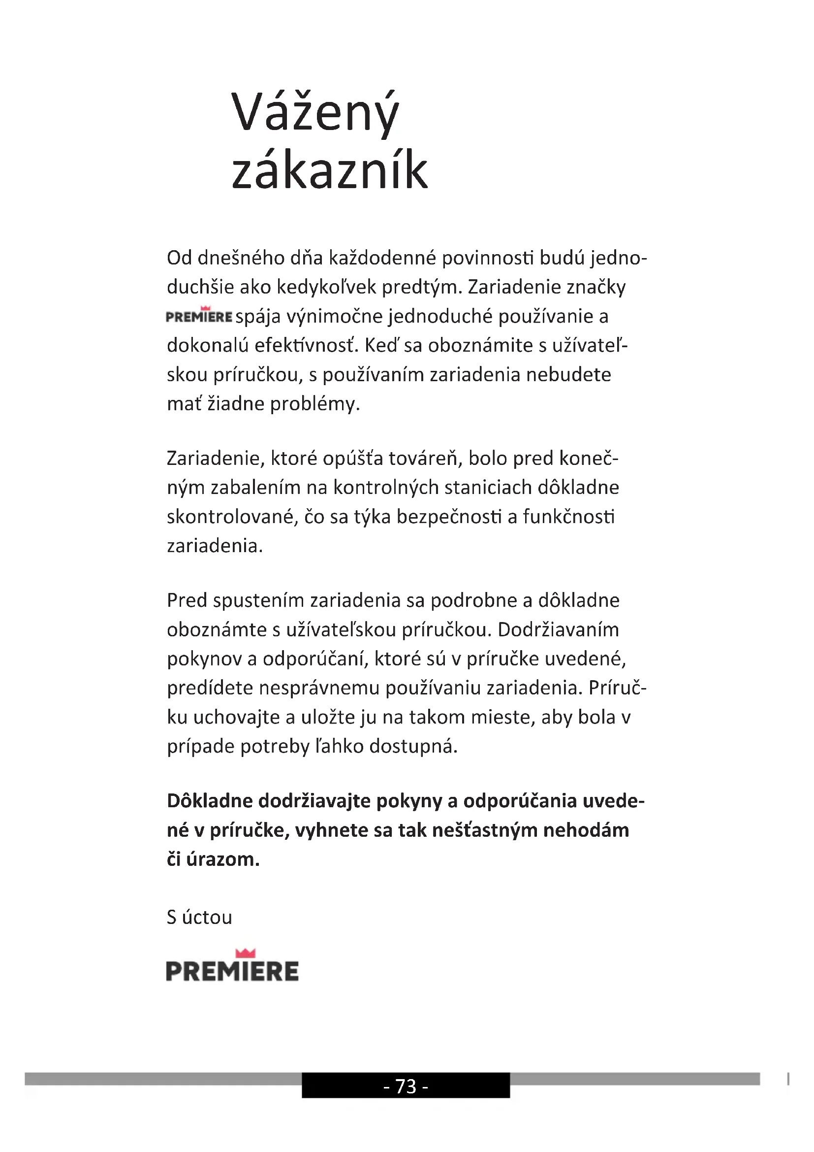 - směrnice RoHS 2011/65/EC a proto byl spotřebič označen a také bylo pro něho vystaveno prohlášení o shodě poskytované orgánům pro dohled nad trhem.- 73 - Vážený zákazník Od dnešného dňa každodenné povinnos budú jedno- duchšie ako kedykoľvek predtým. Zariadenie značky spája výnimočne jednoduché používanie a dokonalú efekvnosť. Keď sa oboznámite s užívateľ- skou príručkou, s používaním zariadenia nebudete mať žiadne problémy. Zariadenie, ktoré opúšťa továreň, bolo pred koneč- ným zabalením na kontrolných staniciach dôkladne skontrolované, čo sa týka bezpečnos a funkčnos zariadenia. Pred spustením zariadenia sa podrobne a dôkladne oboznámte s užívateľskou príručkou. Dodržiavaním pokynov a odporúčaní, ktoré sú v príručke uvedené, predídete nesprávnemu používaniu zariadenia. Príruč- ku uchovajte a uložte ju na takom mieste, aby bola v prípade potreby ľahko dostupná. Dôkladne dodržiavajte pokyny a odporúčania uvede- né v príručke, vyhnete sa tak nešťastným nehodám či úrazom. S úctou- 74 -
