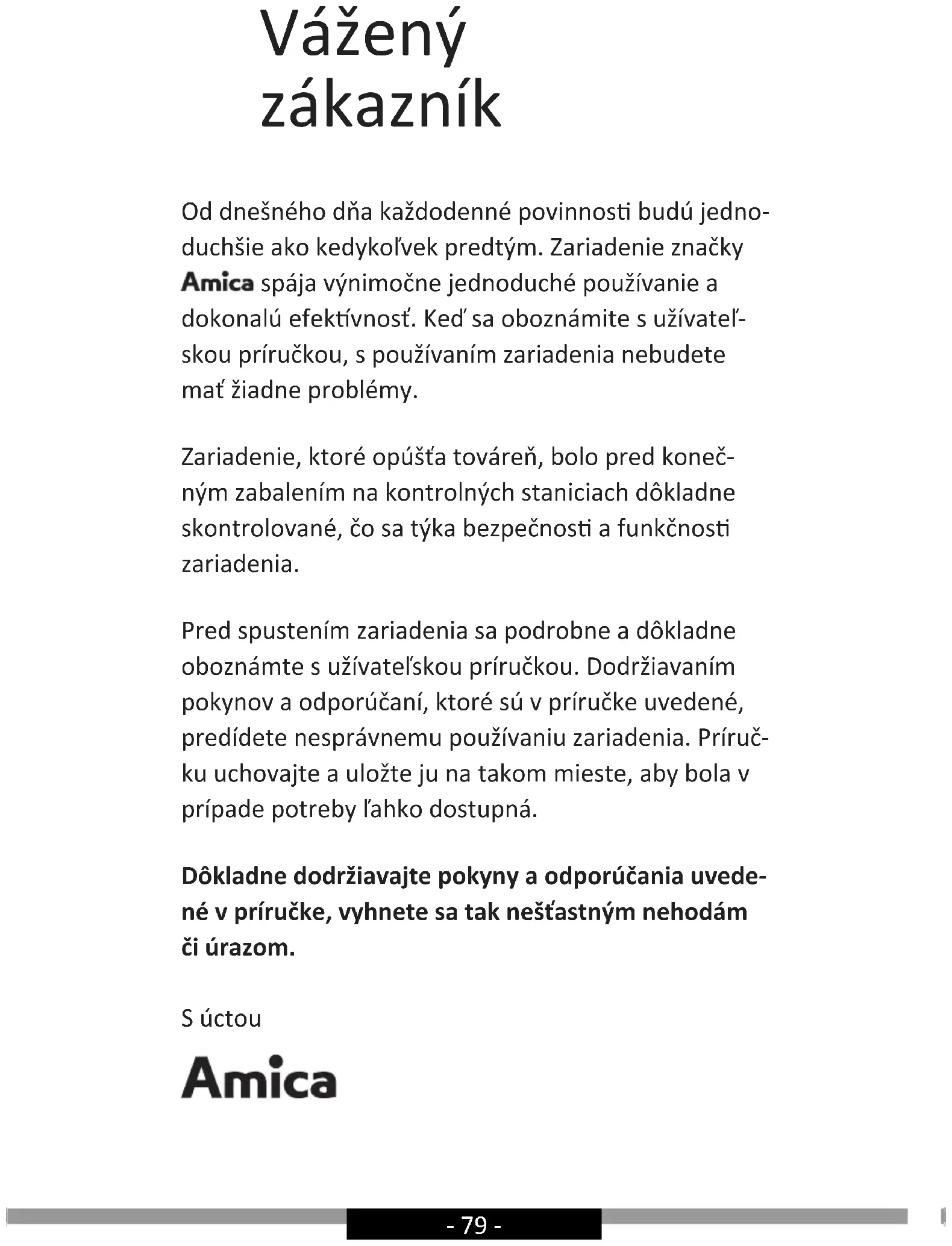 - směrnice RoHS 2011/65/EC a proto byl spotřebič označen a také bylo pro něho vystaveno prohlášení o shodě poskytované orgánům pro dohled nad trhem.- 79 - Vážený zákazník Od dnešného dňa každodenné povinnos budú jedno- duchšie ako kedykoľvek predtým. Zariadenie značky spája výnimočne jednoduché používanie a dokonalú efekvnosť. Keď sa oboznámite s užívateľ- skou príručkou, s používaním zariadenia nebudete mať žiadne problémy. Zariadenie, ktoré opúšťa továreň, bolo pred koneč- ným zabalením na kontrolných staniciach dôkladne skontrolované, čo sa týka bezpečnos a funkčnos zariadenia. Pred spustením zariadenia sa podrobne a dôkladne oboznámte s užívateľskou príručkou. Dodržiavaním pokynov a odporúčaní, ktoré sú v príručke uvedené, predídete nesprávnemu používaniu zariadenia. Príruč- ku uchovajte a uložte ju na takom mieste, aby bola v prípade potreby ľahko dostupná. Dôkladne dodržiavajte pokyny a odporúčania uvede- né v príručke, vyhnete sa tak nešťastným nehodám či úrazom. S úctou- 80 -