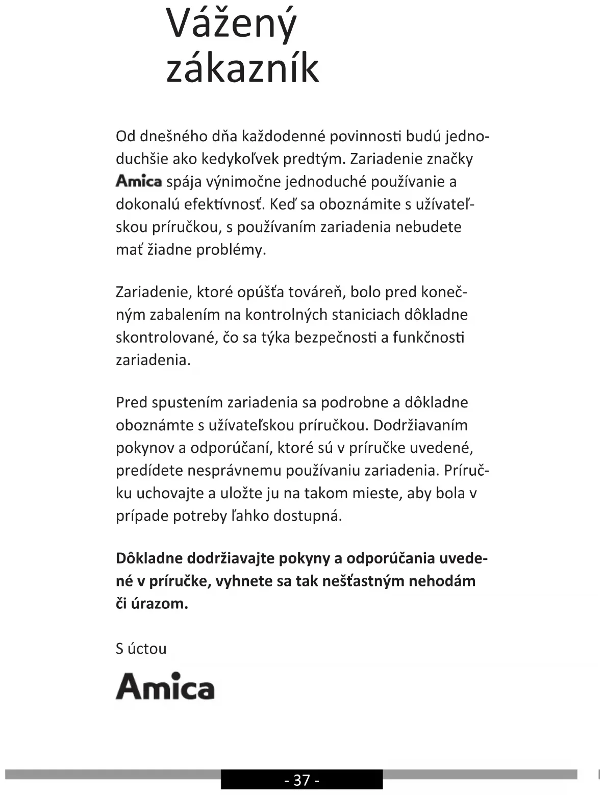 - směrnice RoHS 2011/65/EC a proto byl spotřebič označen a také bylo pro něho vystaveno prohlášení o shodě poskytované orgánům pro dohled nad trhem.- 37 - Vážený zákazník Od dnešného dňa každodenné povinnos budú jedno- duchšie ako kedykoľvek predtým. Zariadenie značky spája výnimočne jednoduché používanie a dokonalú efekvnosť. Keď sa oboznámite s užívateľ- skou príručkou, s používaním zariadenia nebudete mať žiadne problémy. Zariadenie, ktoré opúšťa továreň, bolo pred koneč- ným zabalením na kontrolných staniciach dôkladne skontrolované, čo sa týka bezpečnos a funkčnos zariadenia. Pred spustením zariadenia sa podrobne a dôkladne oboznámte s užívateľskou príručkou. Dodržiavaním pokynov a odporúčaní, ktoré sú v príručke uvedené, predídete nesprávnemu používaniu zariadenia. Príruč- ku uchovajte a uložte ju na takom mieste, aby bola v prípade potreby ľahko dostupná. Dôkladne dodržiavajte pokyny a odporúčania uvede- né v príručke, vyhnete sa tak nešťastným nehodám či úrazom. S úctou- 38 -