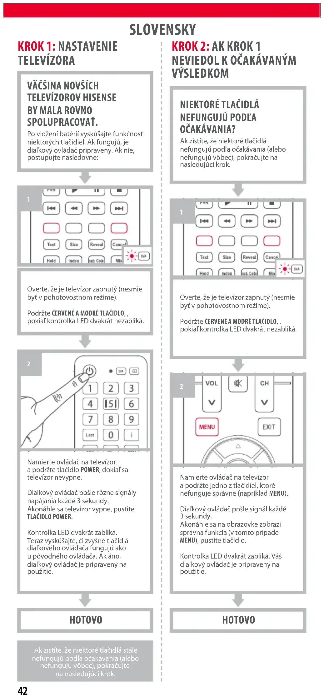 OČAKÁVANIA? Ak zistíte, že niektoré tlačidlá nefungujú podľa očakávania (alebo nefungujú vôbec), pokračujte na nasledujúci krok. Overte, že je televízor zapnutý (nesmie byť v pohotovostnom režime). Podržte ČERVENÉ AMODRÉ TLAČIDLO, , pokiaľ kontrolka LED dvakrát nezabliká. HOTOVO Namierte ovládač na televízor a podržte jedno z tlačidiel, ktoré nefunguje správne (napríklad MENU). Diaľkový ovládač pošle signál každé 3 sekundy.Akonáhle sa na obrazovke zobrazí správna funkcia (v tomto prípade MENU), pustite tlačidlo.Kontrolka LED dvakrát zabliká. Vášdiaľkový ovládač je pripravený na použitie. SLOVENSKY