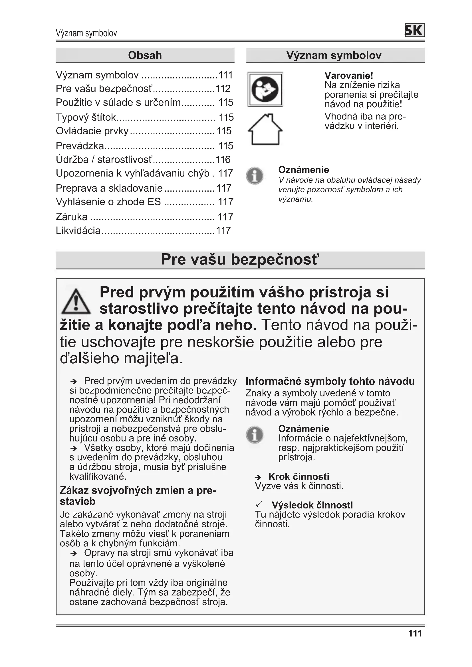 - Likvidácia Význam symbolov Pre vašu bezpečnosť Pred prvým použitím vášho prístroja si starostlivo prečítajte tento návod na pou- žitie a konajte podľa neho. Tento návod na použi- tie uschovajte pre neskoršie použitie alebo pre ďalšieho majiteľa. Î Pred prvým uvedením do prevádzky si bezpodmienečne prečítajte bezpeč- nostné upozornenia! Pri nedodržaní návodu na použitie a bezpečnostných upozornení môžu vzniknúť škody na prístroji a nebezpečenstvá pre obslu- hujúcu osobu a pre iné osoby. Î Všetky osoby, ktoré majú dočinenia s uvedením do prevádzky, obsluhou a údržbou stroja, musia byť príslušne kvalikované. Zákaz svojvoľných zmien a pre- stavieb Je zakázané vykonávať zmeny na stroji alebo vytvárať z neho dodatočné stroje. Takéto zmeny môžu viesť k poraneniam osôb a k chybným funkciám. Î Opravy na stroji smú vykonávať iba na tento účel oprávnené a vyškolené osoby. Používajte pri tom vždy iba originálne náhradné diely. Tým sa zabezpečí, že ostane zachovaná bezpečnosť stroja. Informačné symboly tohto návodu Znaky a symboly uvedené v tomto návode vám majú pomôcť používať návod a výrobok rýchlo a bezpečne. Oznámenie Informácie o najefektívnejšom, resp. najpraktickejšom použití prístroja. Î Krok činnosti Vyzve vás k činnosti. 3 Výsledok činnosti Tu nájdete výsledok poradia krokov činnosti. Varovanie! Na zníženie rizika poranenia si prečítajte návod na použitie! Vhodná iba na pre- vádzku v interiéri. Oznámenie V návode na obsluhu ovládacej násady venujte pozornosť symbolom a ich významu.Pre vašu bezpečnosť p. 117