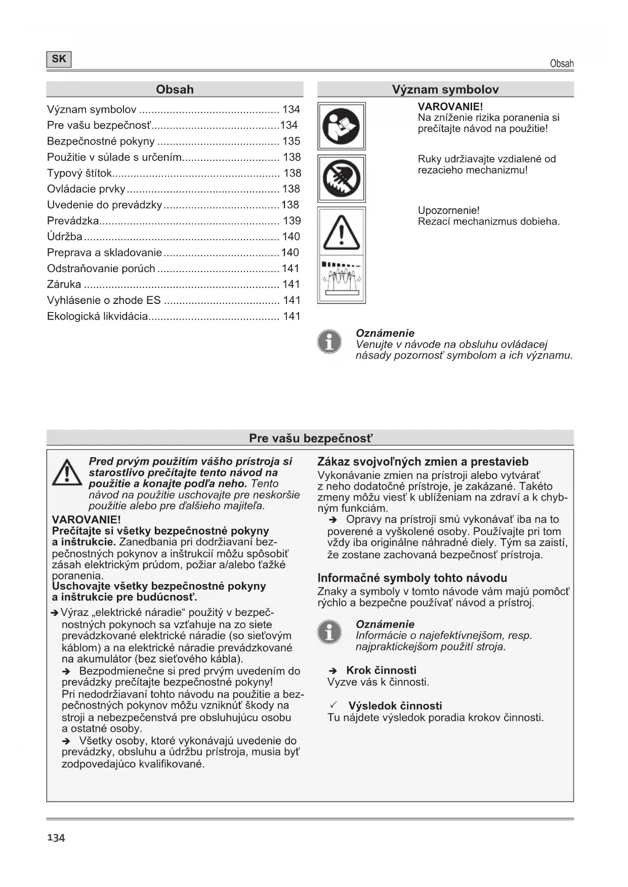 - Ekologická likvidácia Význam symbolov VAROVANIE! Na zníženie rizika poranenia si prečítajte návod na použitie! Ruky udržiavajte vzdialené od rezacieho mechanizmu! Upozornenie! Rezací mechanizmus dobieha. Oznámenie Venujte v návode na obsluhu ovládacej násady pozornosť symbolom a ich významu. Pre vašu bezpečnosť Pred prvým použitím vášho prístroja si starostlivo prečítajte tento návod na použitie a konajte podľa neho. Tento návod na použitie uschovajte pre neskoršie použitie alebo pre ďalšieho majiteľa. VAROVANIE! Prečítajte si všetky bezpečnostné pokyny a inštrukcie. Zanedbania pri dodržiavaní bez- pečnostných pokynov a inštrukcií môžu spôsobiť zásah elektrickým prúdom, požiar a/alebo ťažké poranenia. Uschovajte všetky bezpečnostné pokyny a inštrukcie pre budúcnosť. Î Výraz „elektrické náradie“ použitý v bezpeč- nostných pokynoch sa vzťahuje na zo siete prevádzkované elektrické náradie (so sieťovým káblom) a na elektrické náradie prevádzkované na akumulátor (bez sieťového kábla). Î Bezpodmienečne si pred prvým uvedením do prevádzky prečítajte bezpečnostné pokyny! Pri nedodržiavaní tohto návodu na použitie a bez- pečnostných pokynov môžu vzniknúť škody na stroji a nebezpečenstvá pre obsluhujúcu osobu a ostatné osoby. Î Všetky osoby, ktoré vykonávajú uvedenie do prevádzky, obsluhu a údržbu prístroja, musia byť zodpovedajúco kvalikované. Zákaz svojvoľných zmien a prestavieb Vykonávanie zmien na prístroji alebo vytvárať z neho dodatočné prístroje, je zakázané. Takéto zmeny môžu viesť k ublíženiam na zdraví a k chyb- ným funkciám. Î Opravy na prístroji smú vykonávať iba na to poverené a vyškolené osoby. Používajte pri tom vždy iba originálne náhradné diely. Tým sa zaistí, že zostane zachovaná bezpečnosť prístroja. Informačné symboly tohto návodu Znaky a symboly v tomto návode vám majú pomôcť rýchlo a bezpečne používať návod a prístroj. Oznámenie Informácie o najefektívnejšom, resp. najpraktickejšom použití stroja. Î Krok činnosti Vyzve vás k činnosti. 3 Výsledok činnosti Tu nájdete výsledok poradia krokov činnosti.Pre vašu bezpečnosť p. 141