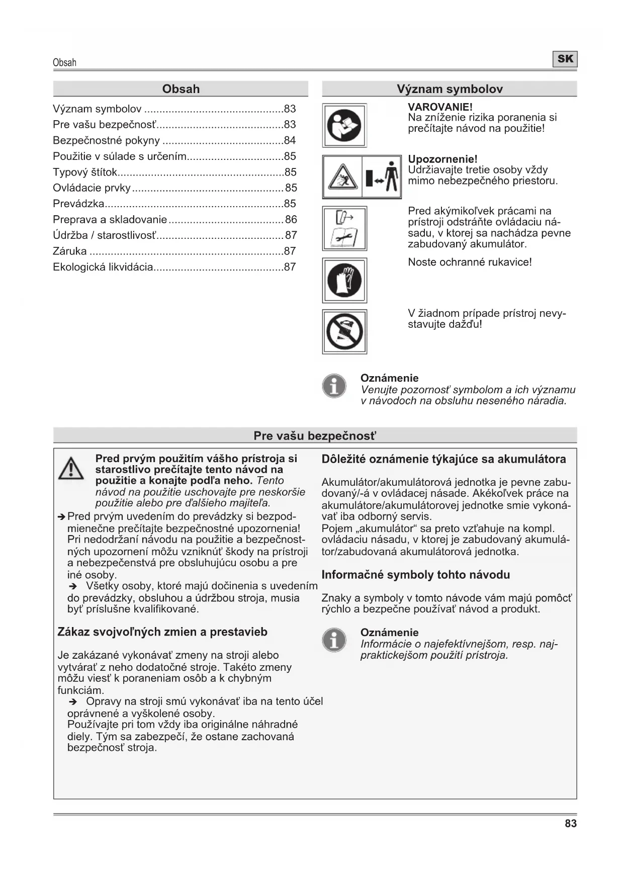 - Predprvýmpoužitímvášhoprístrojasi starostlivoprečítajtetentonávodna použitieakonajtepodľaneho. Tento návod na použitie uschovajte pre neskoršie použitie alebo pre ďalšieho majiteľa. Î Pred prvým uvedením do prevádzky si bezpod- mienečne prečítajte bezpečnostné upozornenia! Pri nedodržaní návodu na použitie a bezpečnost- ných upozornení môžu vzniknúť škody na prístroji a nebezpečenstvá pre obsluhujúcu osobu a pre iné osoby. Î Všetky osoby, ktoré majú dočinenia s uvedením do prevádzky, obsluhou a údržbou stroja, musia byť príslušne kvalikované. Zákazsvojvoľnýchzmienaprestavieb Je zakázané vykonávať zmeny na stroji alebo vytvárať z neho dodatočné stroje. Takéto zmeny môžu viesť k poraneniam osôb a k chybným funkciám. Î Opravy na stroji smú vykonávať iba na tento účel oprávnené a vyškolené osoby. Používajte pri tom vždy iba originálne náhradné diely. Tým sa zabezpečí, že ostane zachovaná bezpečnosť stroja. Dôležitéoznámenietýkajúcesaakumulátora Akumulátor/akumulátorová jednotka je pevne zabu- dovaný/-á v ovládacej násade. Akékoľvek práce na akumulátore/akumulátorovej jednotke smie vykoná- vať iba odborný servis. Pojem „akumulátor“ sa preto vzťahuje na kompl. ovládaciu násadu, v ktorej je zabudovaný akumulá- tor/zabudovaná akumulátorová jednotka. Informačnésymbolytohtonávodu Znaky a symboly v tomto návode vám majú pomôcť rýchlo a bezpečne používať návod a produkt. Oznámenie Informácie o najefektívnejšom, resp. naj- praktickejšom použití prístroja. Obsah Význam symbolov p. 83