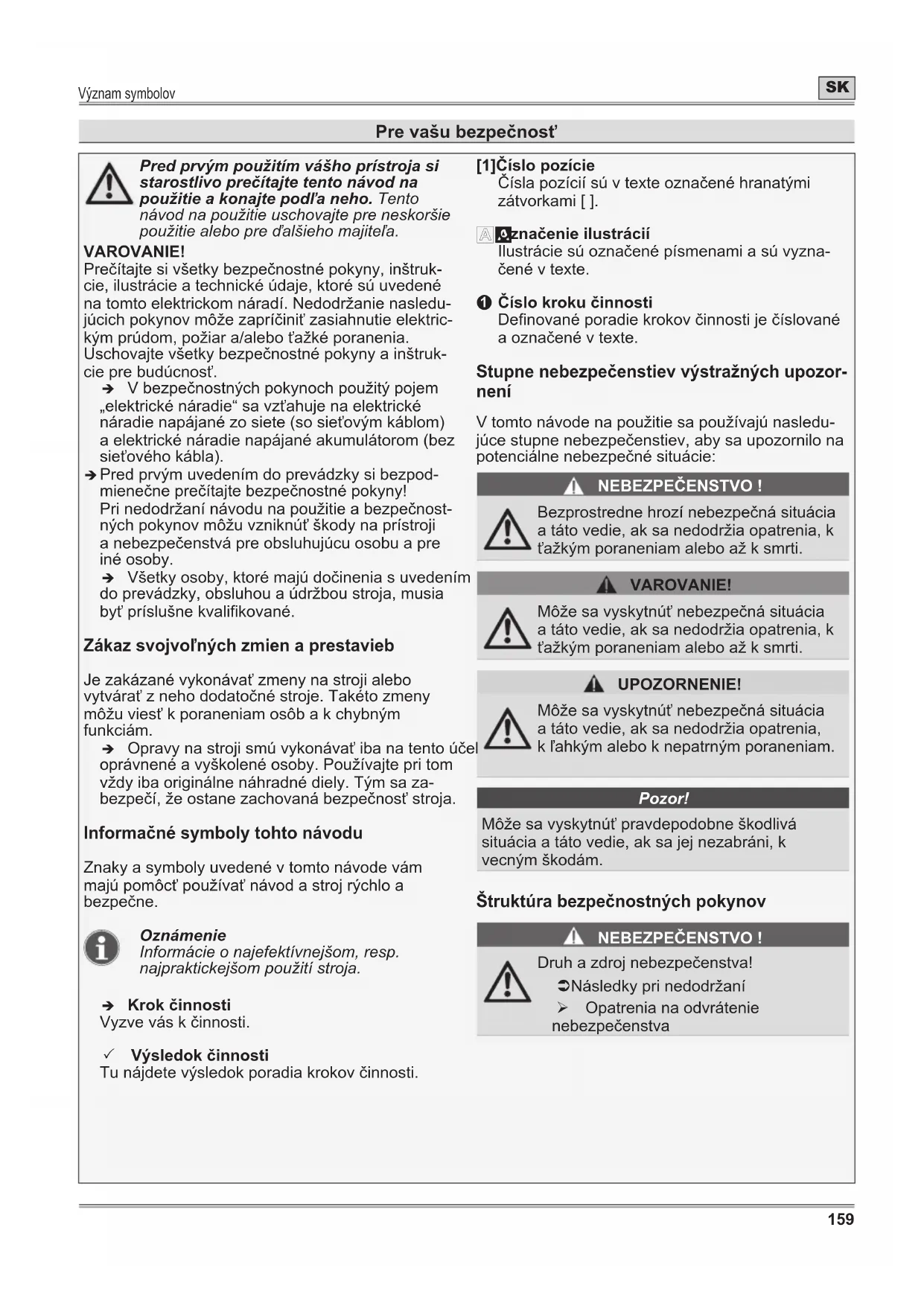 Číslo kroku činnosti Denované poradie krokov činnosti je číslované a označené v texte. Stupne nebezpečenstiev výstražných upozor- není V tomto návode na použitie sa používajú nasledu- júce stupne nebezpečenstiev, aby sa upozornilo na potenciálne nebezpečné situácie: NEBEZPEČENSTVO ! Bezprostredne hrozí nebezpečná situácia a táto vedie, ak sa nedodržia opatrenia, k ťažkým poraneniam alebo až k smrti. VAROVANIE! Môže sa vyskytnúť nebezpečná situácia a táto vedie, ak sa nedodržia opatrenia, k ťažkým poraneniam alebo až k smrti. UPOZORNENIE! Môže sa vyskytnúť nebezpečná situácia a táto vedie, ak sa nedodržia opatrenia, k ľahkým alebo k nepatrným poraneniam. Pozor! Môže sa vyskytnúť pravdepodobne škodlivá situácia a táto vedie, ak sa jej nezabráni, k vecným škodám. Štruktúra bezpečnostných pokynov NEBEZPEČENSTVO ! Druh a zdroj nebezpečenstva! ÂNásledky pri nedodržaní ¾ Opatrenia na odvrátenie nebezpečenstvaBezpečnostné pokyny