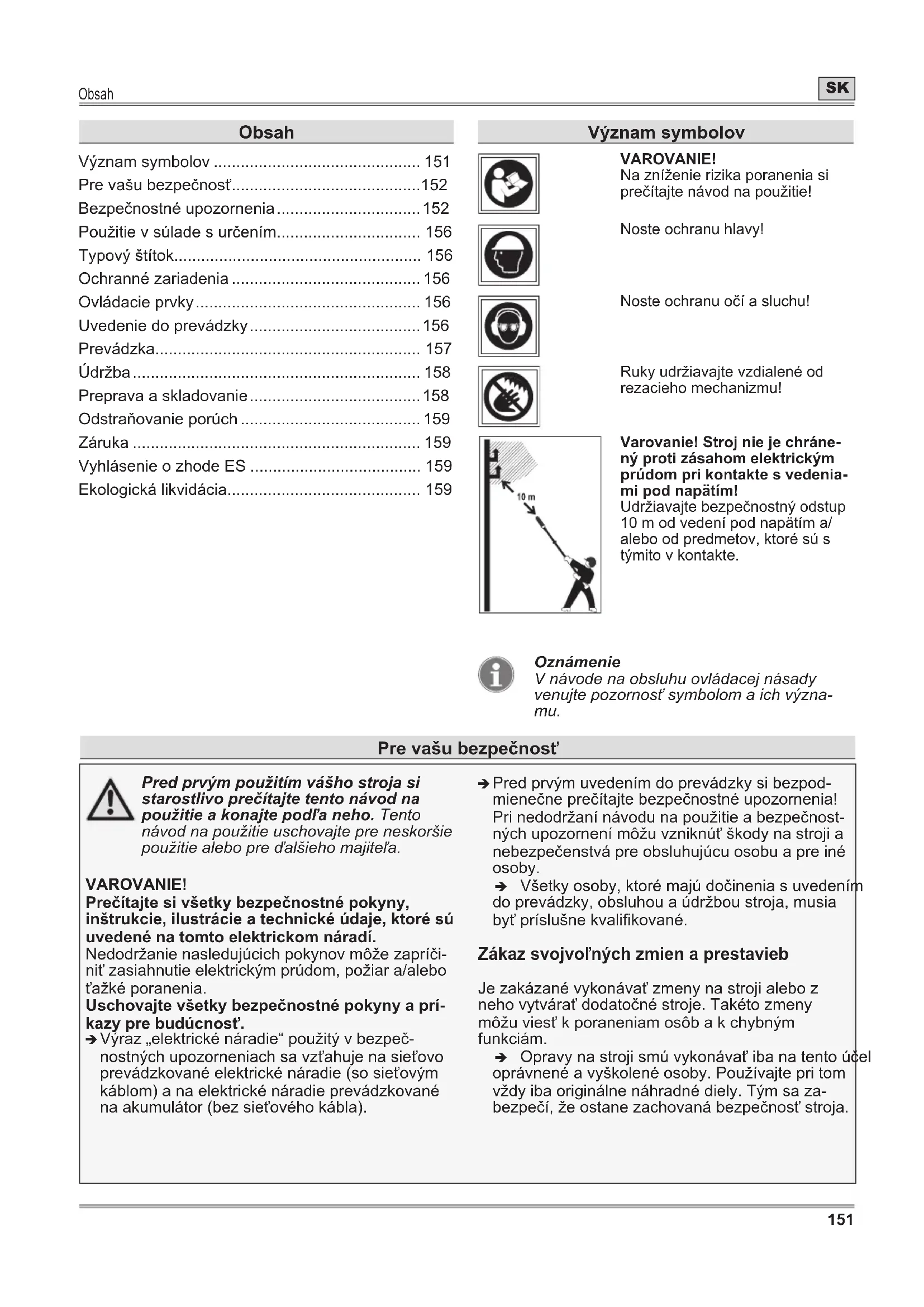 - Ekologická likvidácia Význam symbolov VAROVANIE! Na zníženie rizika poranenia si prečítajte návod na použitie! Noste ochranu hlavy! Noste ochranu očí a sluchu! Ruky udržiavajte vzdialené od rezacieho mechanizmu! Varovanie! Stroj nie je chráne- ný proti zásahom elektrickým prúdom pri kontakte s vedenia- mi pod napätím! Udržiavajte bezpečnostný odstup 10 m od vedení pod napätím a/ alebo od predmetov, ktoré sú s týmito v kontakte. Oznámenie V návode na obsluhu ovládacej násady venujte pozornosť symbolom a ich význa- mu. Pre vašu bezpečnosť Pred prvým použitím vášho stroja si starostlivo prečítajte tento návod na použitie a konajte podľa neho. Tento návod na použitie uschovajte pre neskoršie použitie alebo pre ďalšieho majiteľa. VAROVANIE! Prečítajte si všetky bezpečnostné pokyny, inštrukcie, ilustrácie a technické údaje, ktoré sú uvedené na tomto elektrickom náradí. Nedodržanie nasledujúcich pokynov môže zapríči- niť zasiahnutie elektrickým prúdom, požiar a/alebo ťažké poranenia. Uschovajte všetky bezpečnostné pokyny a prí- kazy pre budúcnosť. Î Výraz „elektrické náradie“ použitý v bezpeč- nostných upozorneniach sa vzťahuje na sieťovo prevádzkované elektrické náradie (so sieťovým káblom) a na elektrické náradie prevádzkované na akumulátor (bez sieťového kábla). Î Pred prvým uvedením do prevádzky si bezpod- mienečne prečítajte bezpečnostné upozornenia! Pri nedodržaní návodu na použitie a bezpečnost- ných upozornení môžu vzniknúť škody na stroji a nebezpečenstvá pre obsluhujúcu osobu a pre iné osoby. Î Všetky osoby, ktoré majú dočinenia s uvedením do prevádzky, obsluhou a údržbou stroja, musia byť príslušne kvalikované. Zákaz svojvoľných zmien a prestavieb Je zakázané vykonávať zmeny na stroji alebo z neho vytvárať dodatočné stroje. Takéto zmeny môžu viesť k poraneniam osôb a k chybným funkciám. Î Opravy na stroji smú vykonávať iba na tento účel oprávnené a vyškolené osoby. Používajte pri tom vždy iba originálne náhradné diely. Tým sa za- bezpečí, že ostane zachovaná bezpečnosť stroja.Pre vašu bezpečnosť p. 159