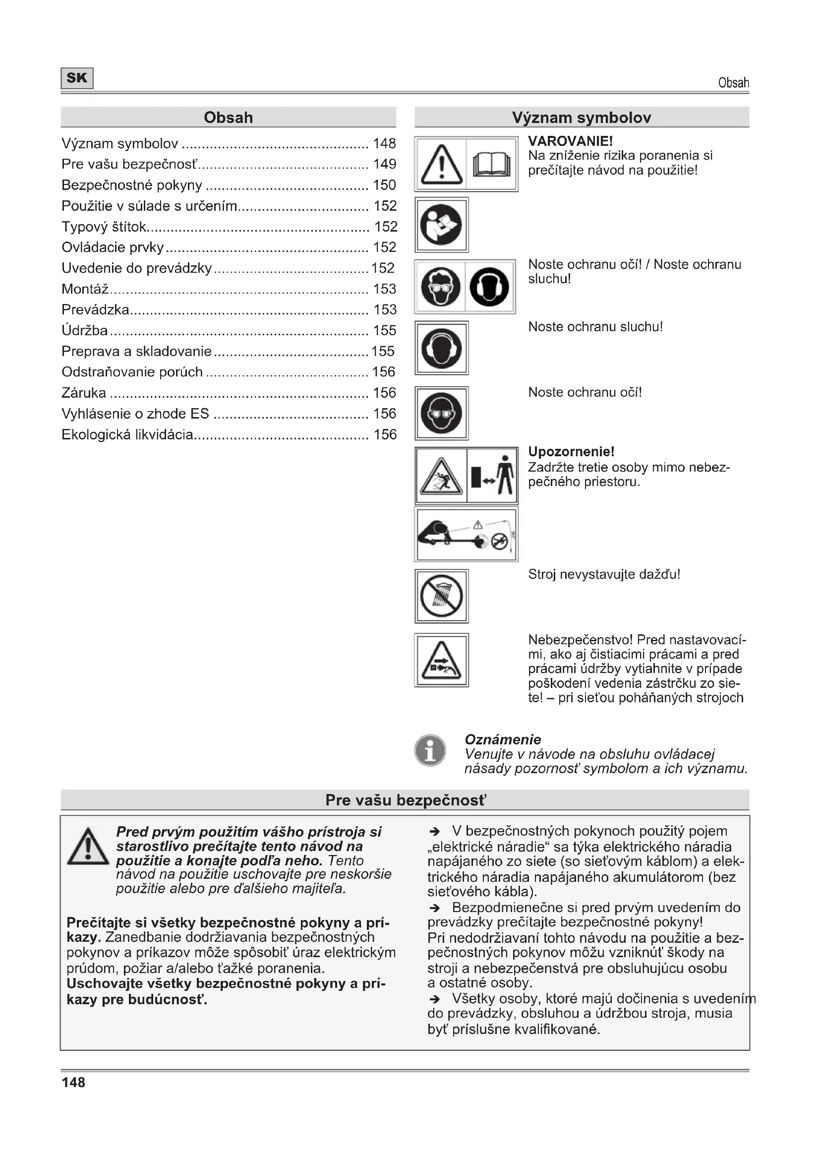 - Ekologická likvidácia Význam symbolov VAROVANIE! Na zníženie rizika poranenia si prečítajte návod na použitie! Noste ochranu očí! / Noste ochranu sluchu! Noste ochranu sluchu! Noste ochranu očí! Upozornenie! Zadržte tretie osoby mimo nebez- pečného priestoru. Stroj nevystavujte dažďu! Nebezpečenstvo! Pred nastavovací- mi, ako aj čistiacimi prácami a pred prácami údržby vytiahnite v prípade poškodení vedenia zástrčku zo sie- te! – pri sieťou poháňaných strojoch Oznámenie Venujte v návode na obsluhu ovládacej násady pozornosť symbolom a ich významu. Pre vašu bezpečnosť Pred prvým použitím vášho prístroja si starostlivo prečítajte tento návod na použitie a konajte podľa neho. Tento návod na použitie uschovajte pre neskoršie použitie alebo pre ďalšieho majiteľa. Prečítajte si všetky bezpečnostné pokyny a prí- kazy. Zanedbanie dodržiavania bezpečnostných pokynov a príkazov môže spôsobiť úraz elektrickým prúdom, požiar a/alebo ťažké poranenia. Uschovajte všetky bezpečnostné pokyny a prí- kazy pre budúcnosť. Î V bezpečnostných pokynoch použitý pojem „elektrické náradie“ sa týka elektrického náradia napájaného zo siete (so sieťovým káblom) a elek- trického náradia napájaného akumulátorom (bez sieťového kábla). Î Bezpodmienečne si pred prvým uvedením do prevádzky prečítajte bezpečnostné pokyny! Pri nedodržiavaní tohto návodu na použitie a bez- pečnostných pokynov môžu vzniknúť škody na stroji a nebezpečenstvá pre obsluhujúcu osobu a ostatné osoby. Î Všetky osoby, ktoré majú dočinenia s uvedením do prevádzky, obsluhou a údržbou stroja, musia byť príslušne kvalikované.Pre vašu bezpečnosť p. 156