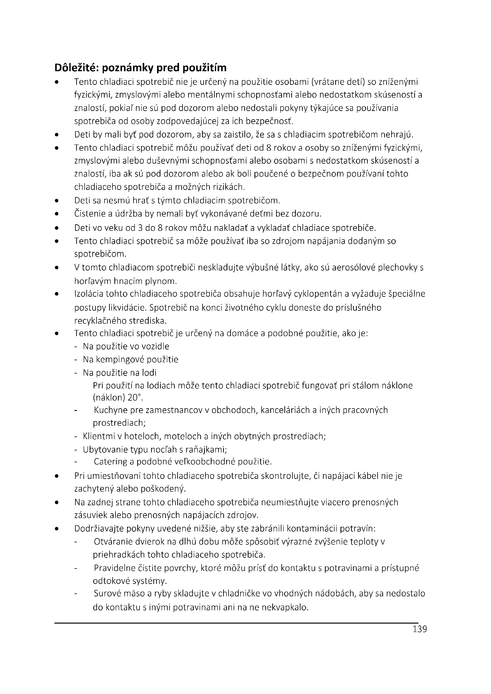 - Tento chladiaci spotrebič nie je určený na použitie osobami (vrátane detí) so zníženými fyzickými, zmyslovými alebo mentálnymi schopnosťami alebo nedostatkom skúseností a znalostí, pokiaľ nie sú pod dozorom alebo nedostali pokyny týkajúce sa používania spotrebiča od osoby zodpovedajúcej za ich bezpečnosť.