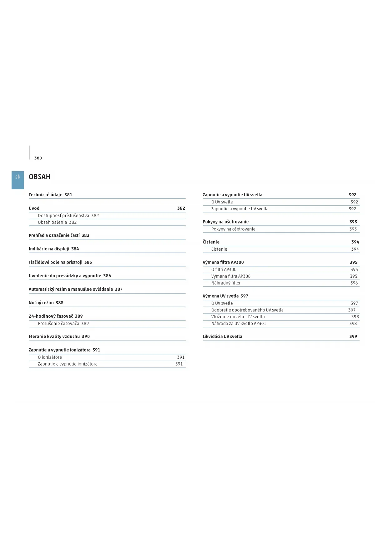 OBSAH Technické údaje 381 Úvod 382 Dostupnosť príslušenstva 382 Obsah balenia 382 Prehľad aoznačenie častí 383 Indikácie na displeji 384 Tlačidlové pole na prístroji 385 Uvedenie do prevádzky avypnutie 386 Automatický režim amanuálne ovládanie 387 Nočný režim 388 24-hodinový časovač 389 Prerušenie časovača 389 Meranie kvality vzduchu 390 Zapnutie avypnutie ionizátora 391 Oionizátore 391 Zapnutie avypnutie ionizátora 391 Zapnutie avypnutie UV svetla 392 OUV svetle 392 Zapnutie avypnutie UV svetla 392 Pokyny na ošetrovanie 393 Pokyny na ošetrovanie 393 Čistenie 394 Čistenie 394 Výmena filtra AP300 395 Ofiltri AP300 395 Výmena filtra AP300 395 Náhradný filter 396 Výmena UV svetla 397 OUV svetle 397 Odobratie opotrebovaného UV svetla 397 Vloženie nového UV svetla 398 Náhrada za UV-svetlo AP301 398 Likvidácia UVsvetla 399381