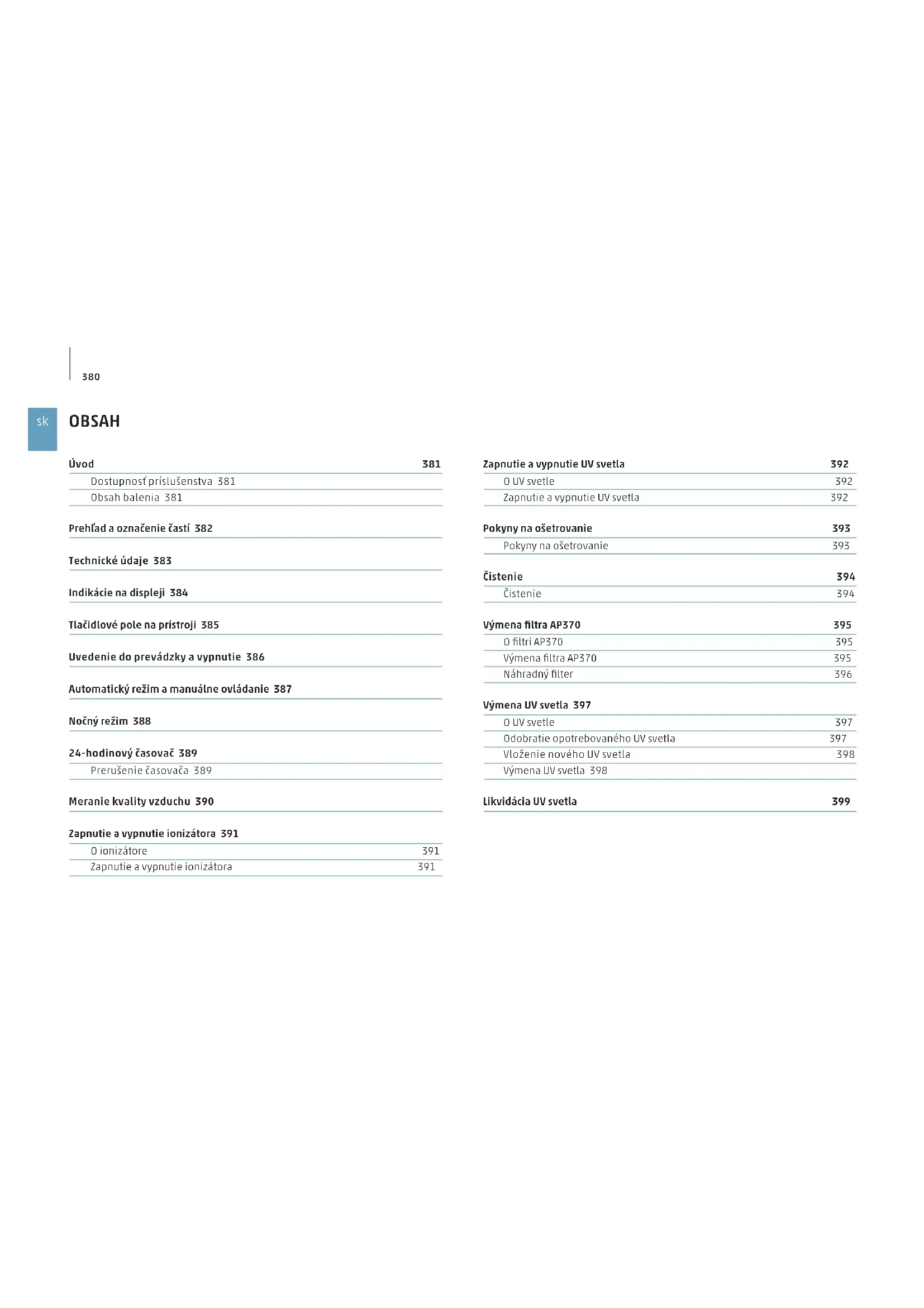 OBSAH Úvod 381 Dostupnosť príslušenstva 381 Obsah balenia 381 Prehľad aoznačenie častí 382 Technické údaje 383 Indikácie na displeji 384 Tlačidlové pole na prístroji 385 Uvedenie do prevádzky avypnutie 386 Automatický režim amanuálne ovládanie 387 Nočný režim 388 24-hodinový časovač 389 Prerušenie časovača 389 Meranie kvality vzduchu 390 Zapnutie avypnutie ionizátora 391 Oionizátore 391 Zapnutie avypnutie ionizátora 391 Zapnutie avypnutie UV svetla 392 OUV svetle 392 Zapnutie avypnutie UV svetla 392 Pokyny na ošetrovanie 393 Pokyny na ošetrovanie 393 Čistenie 394 Čistenie 394 Výmena filtra AP370 395 Ofiltri AP370 395 Výmena filtra AP370 395 Náhradný filter 396 Výmena UV svetla 397 OUV svetle 397 Odobratie opotrebovaného UV svetla 397 Vloženie nového UV svetla 398 Výmena UV svetla 398 Likvidácia UVsvetla 399381