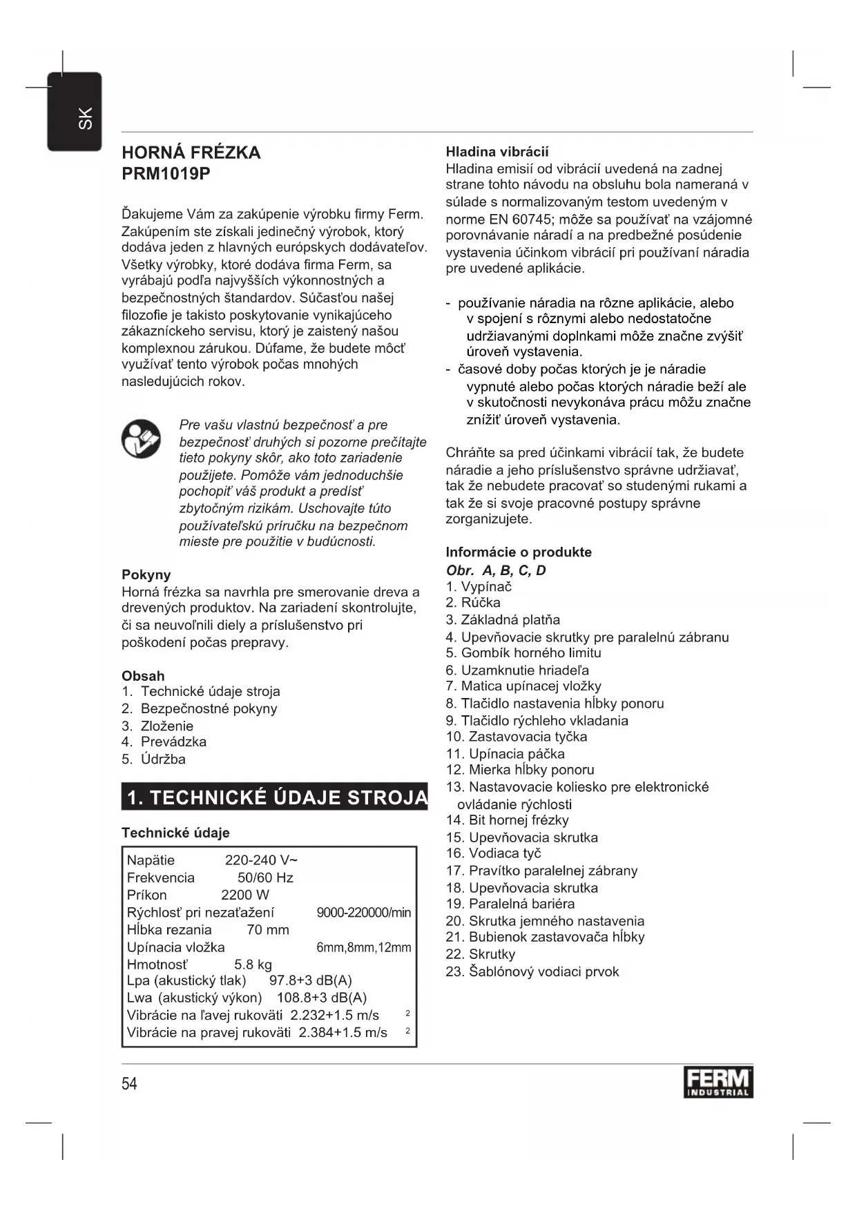 PRM1019P Ďakujeme Vám za zakúpenie výrobku rmy Ferm. Zakúpením ste získali jedinečný výrobok, ktorý dodáva jeden z hlavných európskych dodávateľov. Všetky výrobky, ktoré dodáva rma Ferm, sa vyrábajú podľa najvyšších výkonnostných a bezpečnostných štandardov. Súčasťou našej lozoe je takisto poskytovanie vynikajúceho zákazníckeho servisu, ktorý je zaistený našou komplexnou zárukou. Dúfame, že budete môcť využívať tento výrobok počas mnohých nasledujúcich rokov. Pre vašu vlastnú bezpečnosť a pre bezpečnosť druhých si pozorne prečítajte tieto pokyny skôr, ako toto zariadenie použijete. Pomôže vám jednoduchšie pochopiť váš produkt a predísť zbytočným rizikám. Uschovajte túto používateľskú príručku na bezpečnom mieste pre použitie v budúcnosti. Pokyny Horná frézka sa navrhla pre smerovanie dreva a drevených produktov. Na zariadení skontrolujte, či sa neuvoľnili diely a príslušenstvo pri poškodení počas prepravy. Obsah