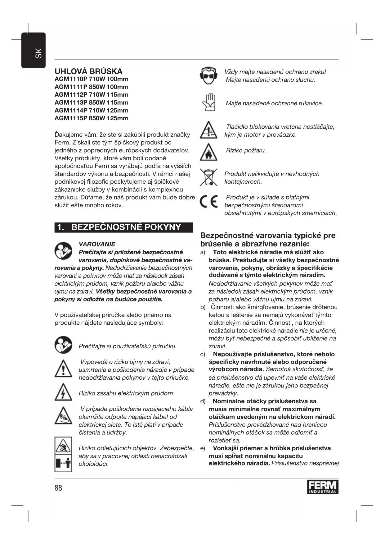 AGM1110P 710W 100mm AGM1111P 850W 100mm AGM1112P 710W 115mm AGM1113P 850W 115mm AGM1114P 710W 125mm AGM1115P 850W 125mm Ďakujeme vám, že ste si zakúpili produkt značky Ferm. Získali ste tým špičkový produkt od jedného z popredných európskych dodávateľov. Všetky produkty, ktoré vám boli dodané spoločnosťou Ferm sa vyrábajú podľa najvyšších štandardov výkonu a bezpečnosti. V rámci našej podnikovej lozoe poskytujeme aj špičkové zákaznícke služby v kombinácii s komplexnou zárukou. Dúfame, že náš produkt vám bude dobre slúžiť ešte mnoho rokov.