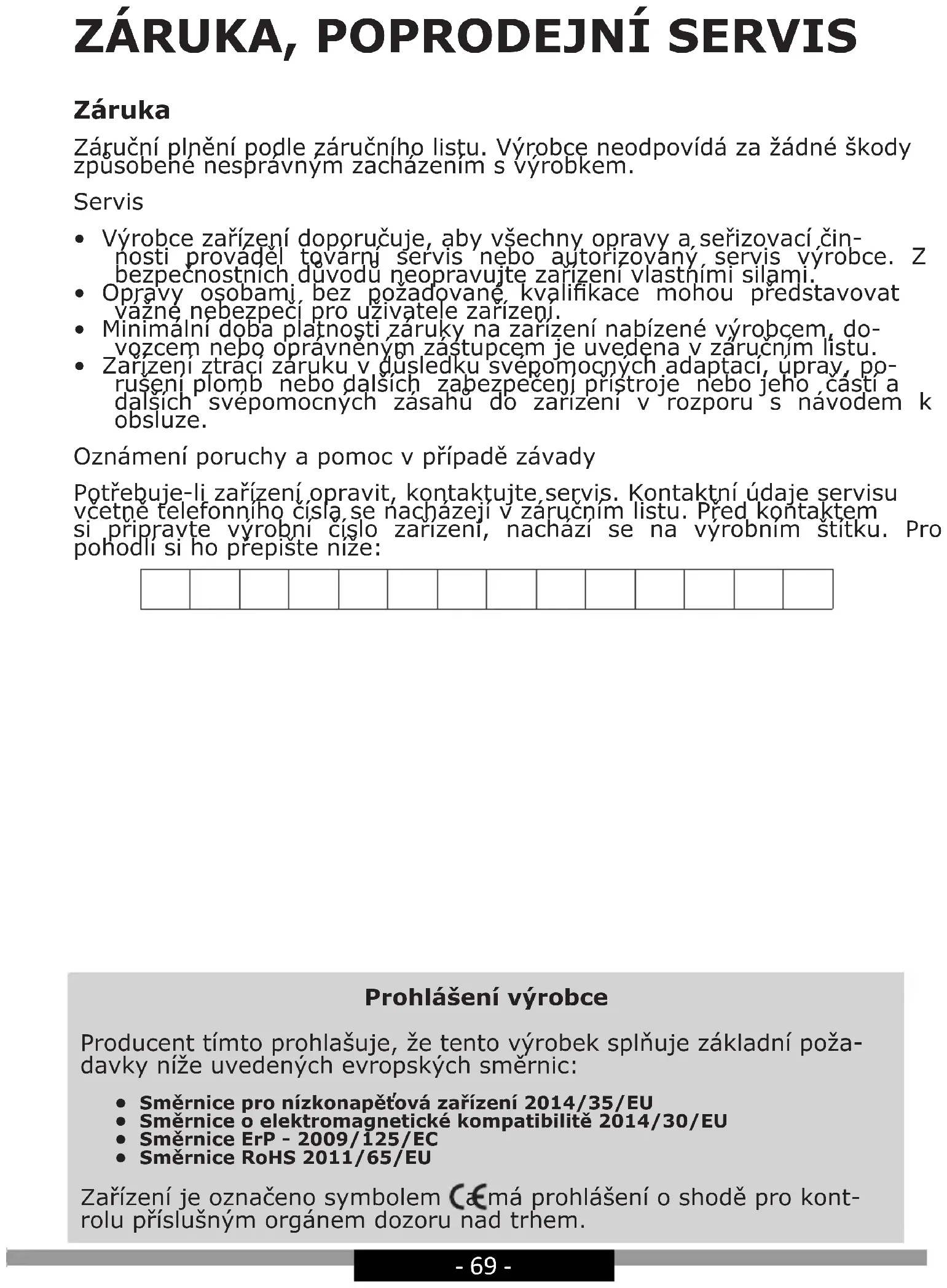 - Záruka na zariadenie prestáva platiť v dôsledku vykonania adap- tácie, prerobenia zariadenia, poškodenia plomb alebo iných ochrán a zabezpečení zariadenia alebo jeho častí alebo v dôsledku iných nepovolených zásahov do zariadenia, vykonaných v rozpore z pou- žívateľskou príručkou. Nahlásenie opravy a pomoc v prípade poruchy Ak je potrebné zariadenie opraviť, obráťte sa na autorizovaný servis. Kontaktné údaje servisu, vrátane kontaktného telefónneho čísla, sú uvedené v záručnom liste. Pred tým, ako sa obrátite na servis, priprav- te sériové číslo zariadenia, ktoré je uvedené na výrobnom štítku. Na uľahčenie ho prepíšte tu: Vyhlásenie výrobcu Výrobca týmto vyhlasuje, že výrobok spĺňa dôležité požiadavky nasledujúcich európskych smerníc: