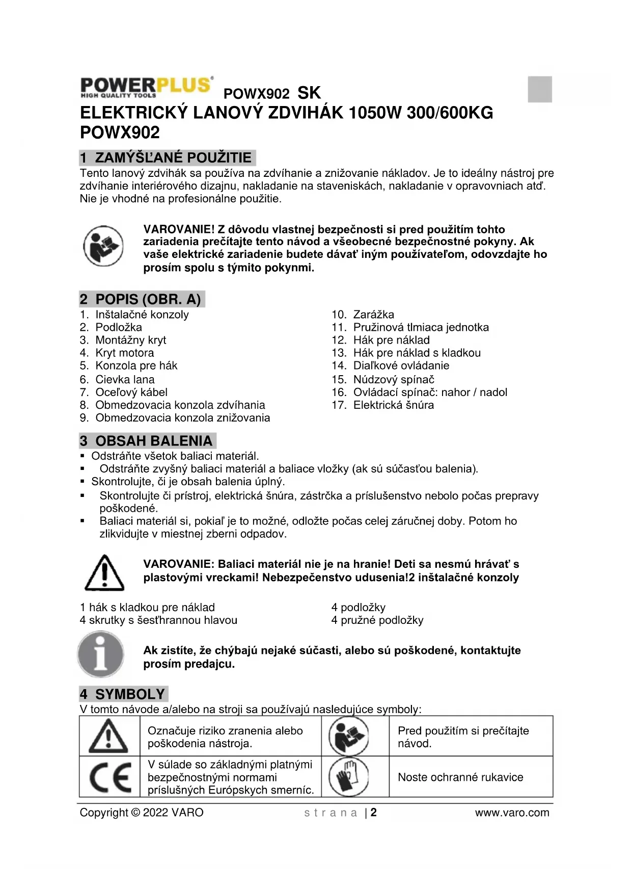- Lanový zdvihák nie je vhodný pre nepretržitú prevádzku. Motor je chránený pred preťažením a prehriatím teplotným spínačom.POWX902 SK Copyright © 2022 VARO s t r a n a | 8 www.varo.com