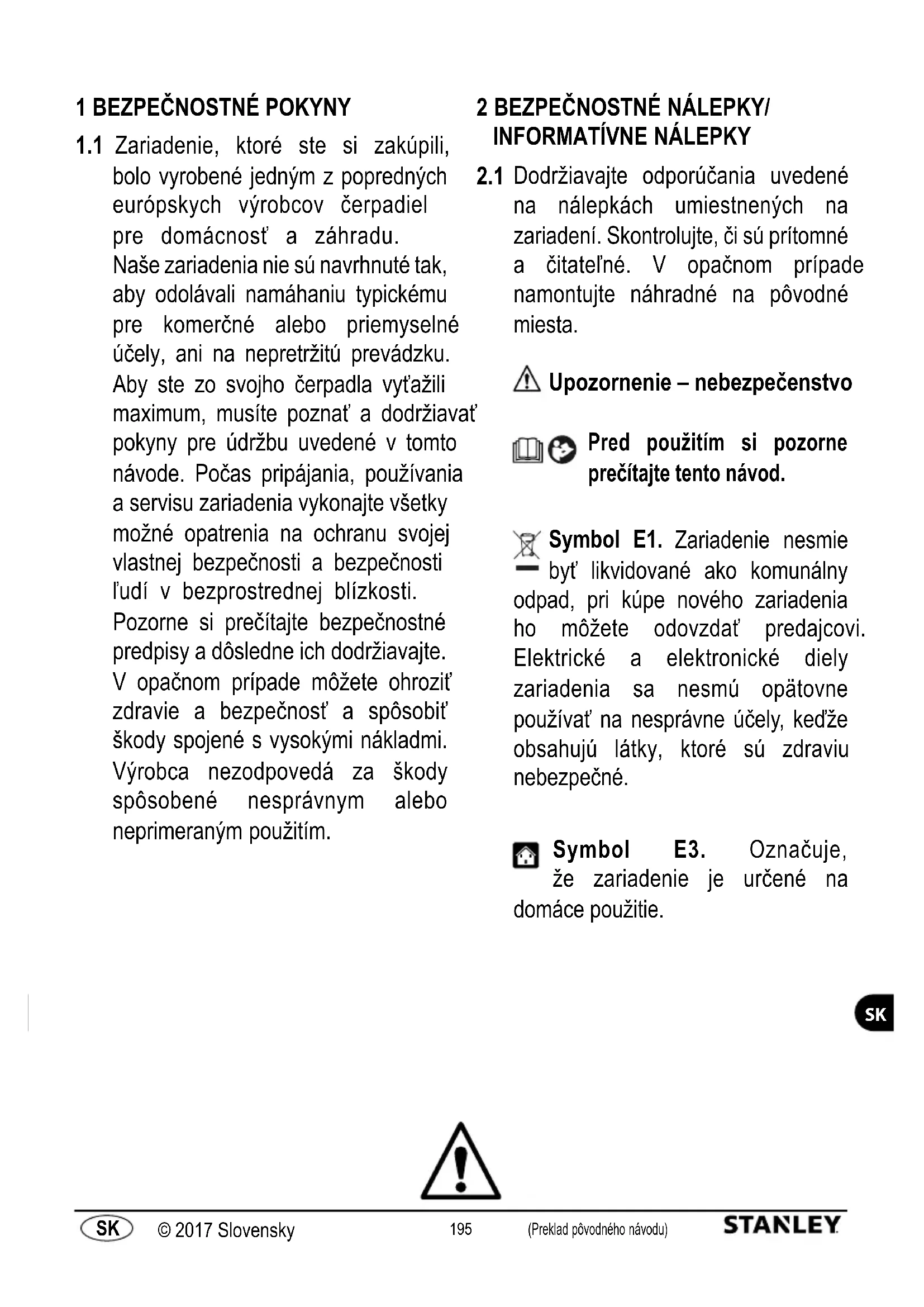 Dodržiavajte odporúčania uvedené na nálepkách umiestnených na zariadení. Skontrolujte, či sú prítomné a čitateľné. V opačnom prípade namontujte náhradné na pôvodné miesta. Upozornenie – nebezpečenstvo Pred použitím si pozorne prečítajte tento návod. Symbol E1. Zariadenie nesmie byť likvidované ako komunálny odpad, pri kúpe nového zariadenia ho môžete odovzdať predajcovi. Elektrické a elektronické diely zariadenia sa nesmú opätovne používať na nesprávne účely, keďže obsahujú látky, ktoré sú zdraviu nebezpečné. Symbol E3. Označuje, že zariadenie je určené na domáce použitie.196 (Preklad pôvodného návodu) © 2017 Slovensky