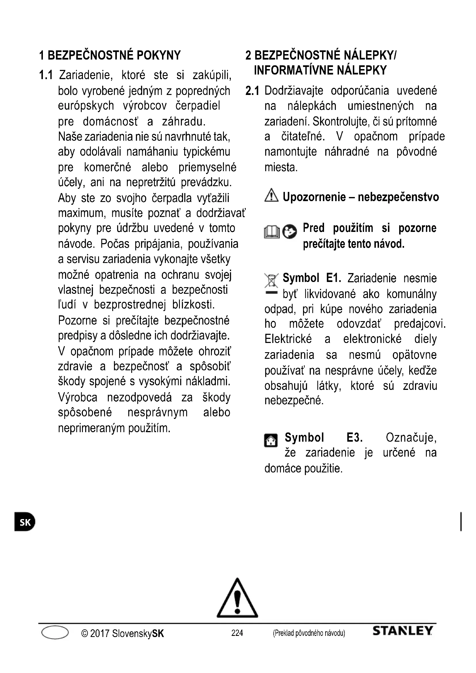 Dodržiavajte odporúčania uvedené na nálepkách umiestnených na zariadení. Skontrolujte, či sú prítomné a čitateľné. V opačnom prípade namontujte náhradné na pôvodné miesta. Upozornenie – nebezpečenstvo Pred použitím si pozorne prečítajte tento návod. Symbol E1. Zariadenie nesmie byť likvidované ako komunálny odpad, pri kúpe nového zariadenia ho môžete odovzdať predajcovi. Elektrické a elektronické diely zariadenia sa nesmú opätovne používať na nesprávne účely, keďže obsahujú látky, ktoré sú zdraviu nebezpečné. Symbol E3. Označuje, že zariadenie je určené na domáce použitie.225 (Preklad pôvodného návodu) © 2017 SlovenskySK