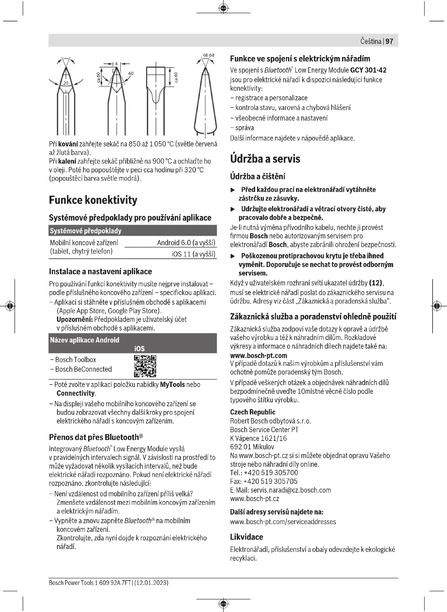 Keď chcete sekáč kovaním upraviť, zohrejte ho na 850 až 1050°C (do svetločervena až žlta). Keď chcete sekáč vytvrdiť, zohrejte ho asi na 900°C aprud- ko ho ochlaďte voleji. Potom ho popúšťajte vpeci cca hodi- nu na 320°C (farba popúšťania svetlomodrá). Funkcie konektivity Systémové predpoklady na používanie aplikácie Systémové predpoklady Mobilné koncové za- riadenie (tablet, smart- fón) Android6.0 (anovšie) iOS11 (anovšie) Inštalácia anastavenie aplikácie Aby ste mohli využívať funkcie konektivity, musíte si najprv nainštalovať špecifickú aplikáciu podľa koncového za- riadenia. – Stiahnite si aplikáciu vpríslušnom obchode aplikácií (Apple App Store, Obchod Google Play). Upozornenie: Predpokladom je vytvorené používateľské konto vdanom obchode saplikáciami. Názov aplikácie Android iOS – Bosch Toolbox – Bosch BeConnected – Následne si vyberte vaplikácii položku MyTools alebo Connectivity. – Displej vášho mobilného koncového zariadenia zobrazí všetky ďalšie kroky týkajúce sa prepojenia elektrického náradia skoncovým zariadením. Prenos údajov prostredníctvom Bluetooth® Zabudovaný modul Bluetooth