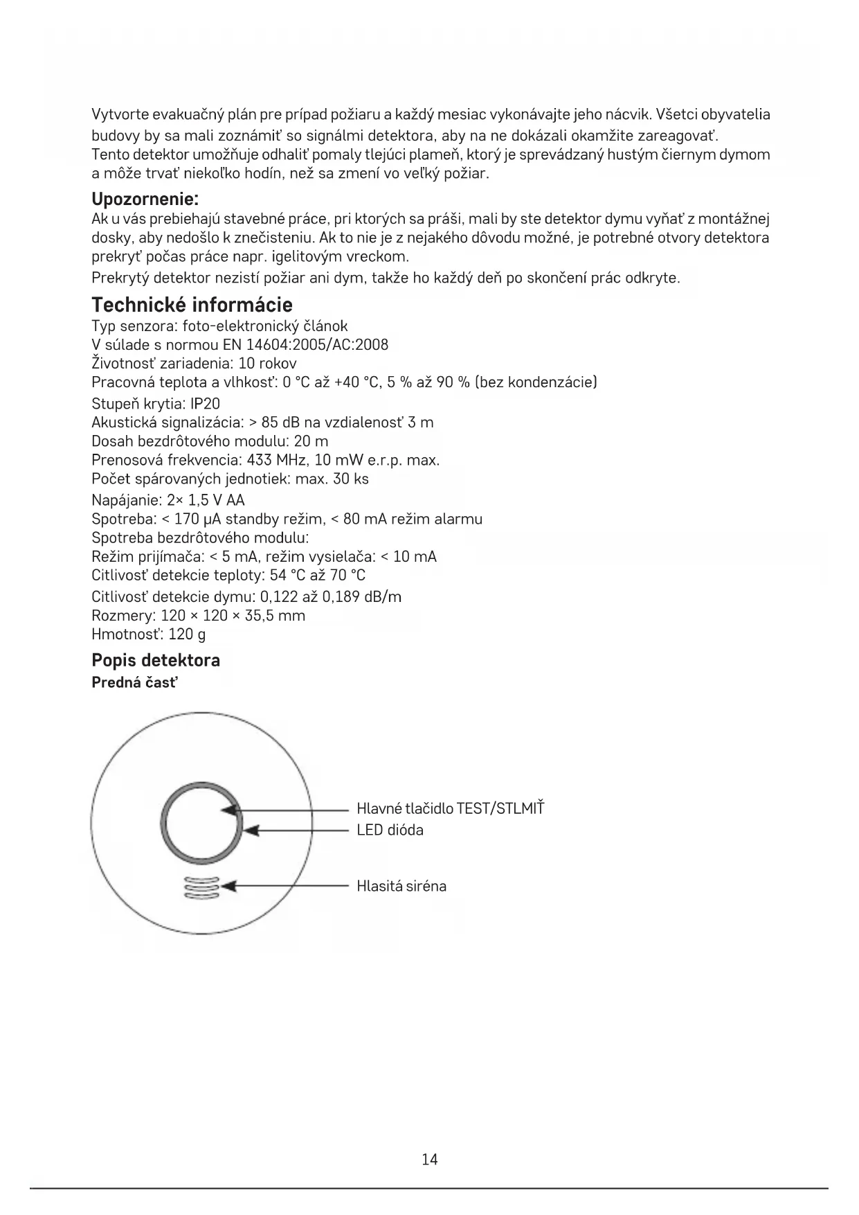 LED prestane svietiť – pamäť detektora je vymazaná. Týmto spôsobom môžete postupne vymazať pamäť u ďalších spárovaných detektorov. Testovanie spárovaných detektorov Stlačte a držte hlavné tlačidlo detektora po dobu max. cca 45 sekúnd. Postupne začnú pípať všetky ostatné spárované detektory. Týmto spôsobom si overíte, že spárovanie detektorov prebehlo v poriadku. Režim alarmu zrušíte u pípajúcich detektorov stlačením hlavného tlačidla. Detektory prejdú do režimu manuálneho stlmenia alarmu, ktorý trvá 10 minút. Potom automaticky prejdú do normálneho režimu.19 Starostlivosť a údržba Výrobok je navrhnutý tak, aby pri vhodnom zaobchádzaní spoľahlivo slúžil niekoľko rokov. Tu je niekoľko rád pre správnu obsluhu: