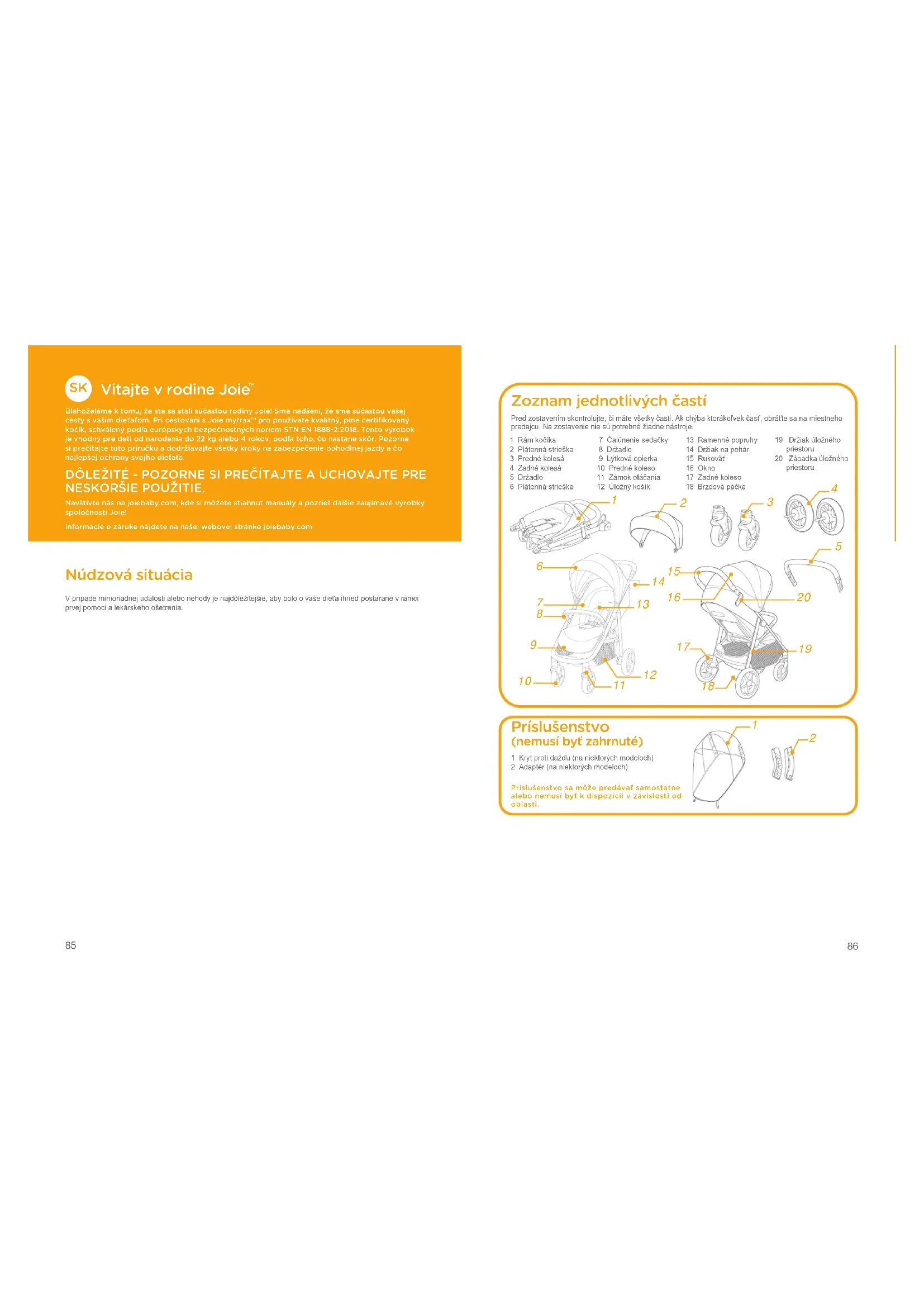 Blahoželáme k tomu, že ste sa stali súčasťou rodiny Joie! Sme nadšení, že sme súčasťou vašej cesty s vašim dieťaťom. Pri cestovaní s Joie mytrax™ pro používate kvalitný, plne certifikovaný kočík, schválený podľa európskych bezpečnostných noriem STN EN 1888-2:2018. Tento výrobok je vhodný pre deti od narodenia do 22 kg alebo 4 rokov, podľa toho, čo nastane skôr. Pozorne si prečítajte túto príručku a dodržiavajte všetky kroky na zabezpečenie pohodlnej jazdy a čo najlepšej ochrany svojho dieťaťa. DÔLEŽITÉ - POZORNE SI PREČÍTAJTE A UCHOVAJTE PRE NESKORŠIE POUŽITIE. Navštívte nás na joiebaby.com, kde si môžete stiahnuť manuály a pozrieť ďalšie zaujímavé výrobky spoločnosti Joie!Informácie o záruke nájdete na našej webovej stránke joiebaby.com Núdzová situácia V prípade mimoriadnej udalosti alebo nehody je najdôležitejšie, aby bolo o vaše dieťa ihneď postarané v rámci prvej pomoci a lekárskeho ošetrenia.