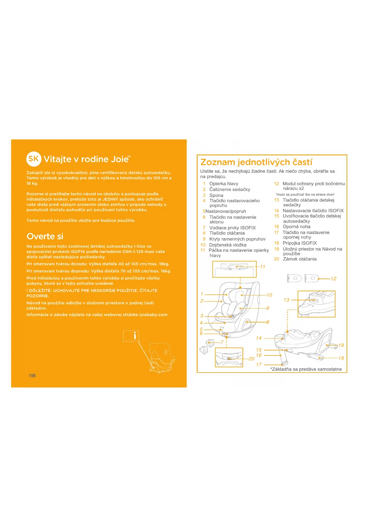 Zakúpili ste si vysokokvalitnú﹐ plne certifikovanú detskú autosedačku. Tento výrobok je vhodný pre deti s výškou a hmotnosťou do 105 cm a 18 kg.Pozorne si prečítajte tento návod na obsluhu a postupuje podľa inštalačných krokov﹐ pretože toto je JEDINÝ spôsob﹐ ako ochrániť vaše dieťa pred vážnym zranením alebo smrťou v prípade nehody a poskytnúť dieťaťu pohodlie pri používaní tohto výrobku.Tento návod na použitie uložte pre budúce použitie. Overte si Na používanie tejto zosilnenej detskej autosedačky i-Size so spojovacími prvkami ISOFIX podľa nariadenia OSN č.129 musí vaše dieťa spĺňať nasledujúce požiadavky.Pri smerovaní tvárou dozadu: Výška dieťaťa 40 až 105 cm/max. 18kg.Pri smerovaní tvárou dopredu: Výška dieťaťa 76 až 105 cm/max. 18kg.Pred inštaláciou a používaním tohto výrobku si prečítajte všetky pokyny﹐ ktoré sú v tejto príručke uvedené.! DÔLEŽITÉ: UCHOVAJTE PRE NESKORŠIE POUŽITIE. ČÍTAJTE POZORNE.Návod na použitie odložte v úložnom priestore v zadnej časti základne.Informácie o záruke nájdete na našej webovej stránke joiebaby.com Zoznam jednotlivých častí 1 Opierka hlavy 2 Čalúnenie sedačky 3 Spona 4 Tlačidlo nastavovacieho popruhu 5 Nastavovací popruh 6 Tlačidlo na nastavenie sklonu 7 Vodiace prvky ISOFIX 8 Tlačidlo otáčania 9 Kryty ramenných popruhov10 Dojčenská vložka11 Páčka na nastavenie opierky hlavy12 Modul ochrany proti bočnému nárazu x2 *musí sa používať iba na strane dverí13 Tlačidlo otáčania detskej sedačky14 Nastavovacie tlačidlo ISOFIX15 Uvoľňovacie tlačidlo detskej autosedačky16 Oporná noha17 Tlačidlo na nastavenie opornej nohy18 Prípojka ISOFIX19 Úložný priestor na Návod na použitie20 Zámok otáčaniaUistite sa, že nechýbajú žiadne časti. Ak niečo chýba, obráťte sa na predajcu. *Základňa sa predáva samostatne