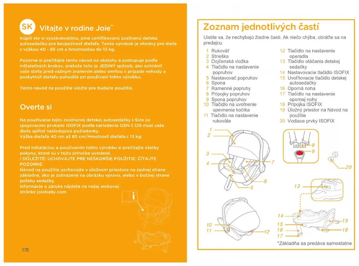 Kúpili ste si vysokokvalitnú﹐ plne certifikovanú zosilnenú detskú autosedačku pre bezpečnosť dieťaťa. Tento výrobok je vhodný pre dieťa s výškou 40 - 85 cm a hmotnosťou do 13 kg.Pozorne si prečítajte tento návod na obsluhu a postupuje podľa inštalačných krokov﹐ pretože toto je JEDINÝ spôsob﹐ ako ochrániť vaše dieťa pred vážnym zranením alebo smrťou v prípade nehody a poskytnúť dieťaťu pohodlie pri používaní tohto výrobku.Tento návod na použitie uložte pre budúce použitie. Overte si Na používanie tejto zosilnenej detskej autosedačky i-Size so spojovacími prvkami ISOFIX podľa nariadenia OSN č.129 musí vaše dieťa spĺňať nasledujúce požiadavky.Výška dieťaťa 40 cm až 85 cm/Hmotnosť dieťaťa 13 kg;Pred inštaláciou a používaním tohto výrobku si prečítajte všetky pokyny﹐ ktoré sú v tejto príručke uvedené.! DÔLEŽITÉ: UCHOVAJTE PRE NESKORŠIE POUŽITIE. ČÍTAJTE POZORNE.Návod na použitie uschovajte v úložnom priestore na zadnej strane základne﹐ ako je zobrazené na obrázku vpravo﹐ alebo v bočnej strane poťahu sedačky.Informácie o záruke nájdete na našej webovej stránke joiebaby.comUistite sa, že nechýbajú žiadne časti. Ak niečo chýba, obráťte sa na predajcu. 1 Rukoväť 2 Strieška 3 Dojčenská vložka 4 Tlačidlo na nastavenie popruhov 5 Nastavovač popruhov 6 Spona 7 Ramenné popruhy 8 Prípojky popruhov 9 Spona popruhov10 Tlačidlo na uvoľnenie upevnenia kočíka11 Tlačidlo na nastavenie rukoväte Zoznam jednotlivých častí 12 Tlačidlo na nastavenie operadla13 Tlačidlo otáčania detskej sedačky14 Nastavovacie tlačidlo ISOFIX15 Uvoľňovacie tlačidlo detskej autosedačky16 Oporná noha17 Tlačidlo na nastavenie opornej nohy18 Prípojka ISOFIX19 Úložný priestor na Návod na použitie20 Vodiace prvky ISOFIX *Základňa sa predáva samostatne