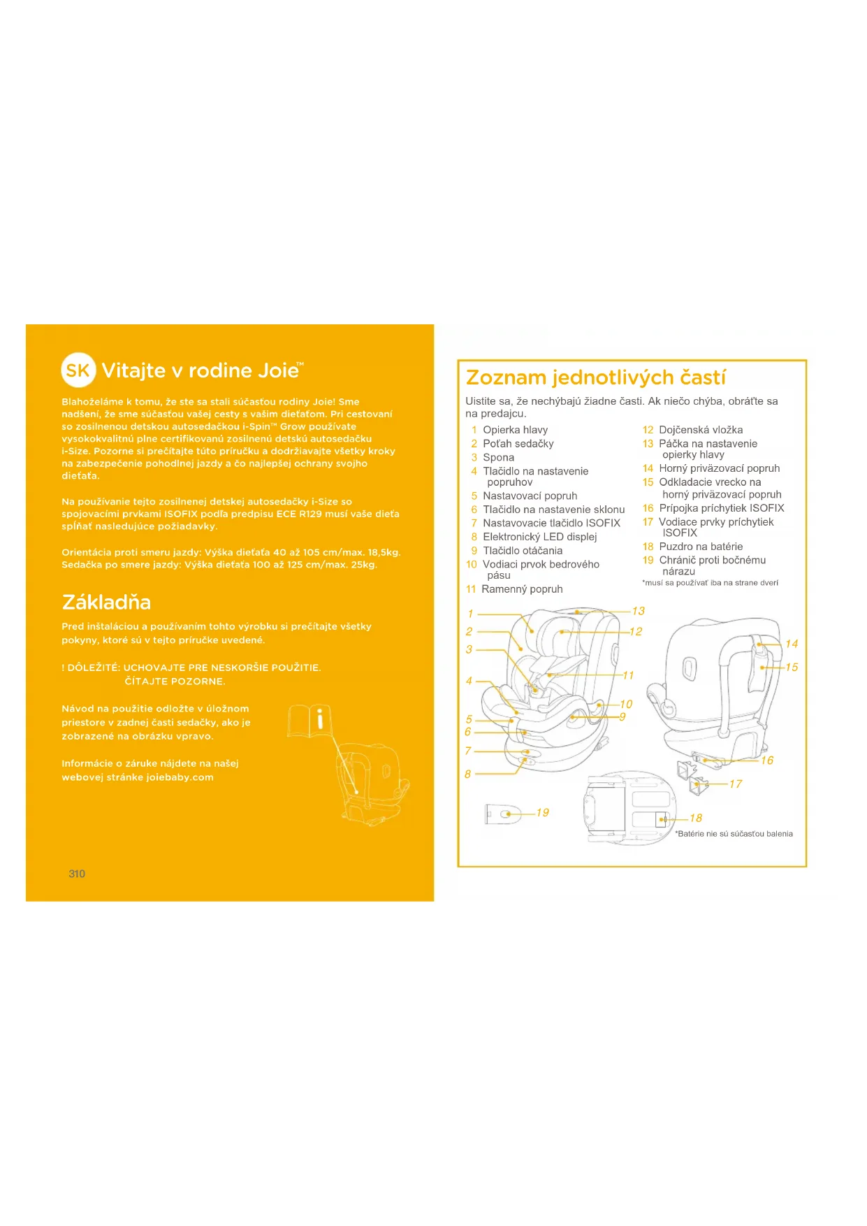 Blahoželáme k tomu, že ste sa stali súčasťou rodiny Joie! Sme nadšení, že sme súčasťou vašej cesty s vašim dieťaťom. Pri cestovaní so zosilnenou detskou autosedačkou i-Spin™ Grow používate vysokokvalitnú plne certifikovanú zosilnenú detskú autosedačku i-Size. Pozorne si prečítajte túto príručku a dodržiavajte všetky kroky na zabezpečenie pohodlnej jazdy a čo najlepšej ochrany svojho dieťaťa.Na používanie tejto zosilnenej detskej autosedačky i-Size so spojovacími prvkami ISOFIX podľa predpisu ECE R129 musí vaše dieťa spĺňať nasledujúce požiadavky.Orientácia proti smeru jazdy: Výška dieťaťa 40 až 105 cm/max. 18,5kg.Sedačka po smere jazdy: Výška dieťaťa 100 až 125 cm/max. 25kg. Základňa Pred inštaláciou a používaním tohto výrobku si prečítajte všetky pokyny, ktoré sú v tejto príručke uvedené.! DÔLEŽITÉ: UCHOVAJTE PRE NESKORŠIE POUŽITIE.ČÍTAJTE POZORNE.Návod na použitie odložte v úložnom priestore v zadnej časti sedačky, ako je zobrazené na obrázku vpravo.Informácie o záruke nájdete na našej webovej stránke joiebaby.com Zoznam jednotlivých častí 1 Opierka hlavy 2 Poťah sedačky 3 Spona 4 Tlačidlo na nastavenie popruhov 5 Nastavovací popruh 6 Tlačidlo na nastavenie sklonu 7 Nastavovacie tlačidlo ISOFIX 8 Elektronický LED displej 9 Tlačidlo otáčania10 Vodiaci prvok bedrového pásu 11 Ramenný popruh12 Dojčenská vložka13 Páčka na nastavenie opierky hlavy14 Horný priväzovací popruh15 Odkladacie vrecko na horný priväzovací popruh16 Prípojka príchytiek ISOFIX17 Vodiace prvky príchytiek ISOFIX18 Puzdro na batérie19 Chránič proti bočnému nárazuUistite sa, že nechýbajú žiadne časti. Ak niečo chýba, obráťte sa na predajcu.