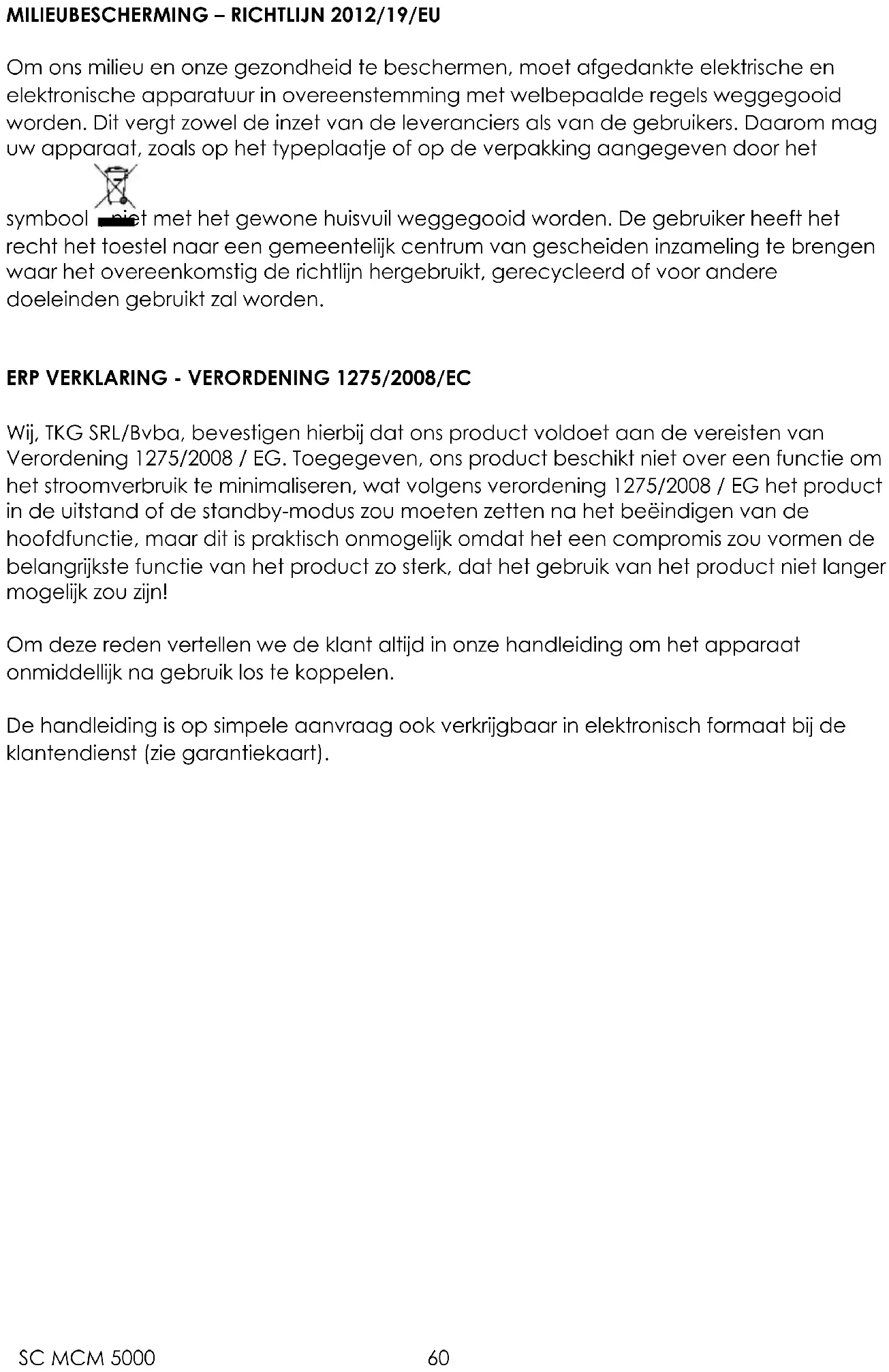 My, TKG SRL / Bvba, týmto potvrdzujeme, že náš výrobok spĺňa požiadavky nariadenia 1275/2008 / ES. Aj keď náš výrobok nemá k dispozícii funkciu na minimalizáciu spotreby energie, ktorá by podľa nariadenia 1275/2008 / ES mala po dokončení hlavnej funkcie výrobok vypnúť alebo prepnúť do pohotovostného režimu, čo je však prakticky nemožné, pretože by to mohlo ohroziť hlavnú funkciu výrobku natoľko, že používanie výrobku by už nebolo možné! Z tohto dôvodu vždy informujeme zákazníka v našom návode na obsluhu, aby spotrebič ihneď po použití odpojil zo siete. Návod na použitie je dostupný aj v elektronickej verzií, stačí si ho vyžiadať u autorizovaného servisu (pozri záručný list).SC MCM 5000