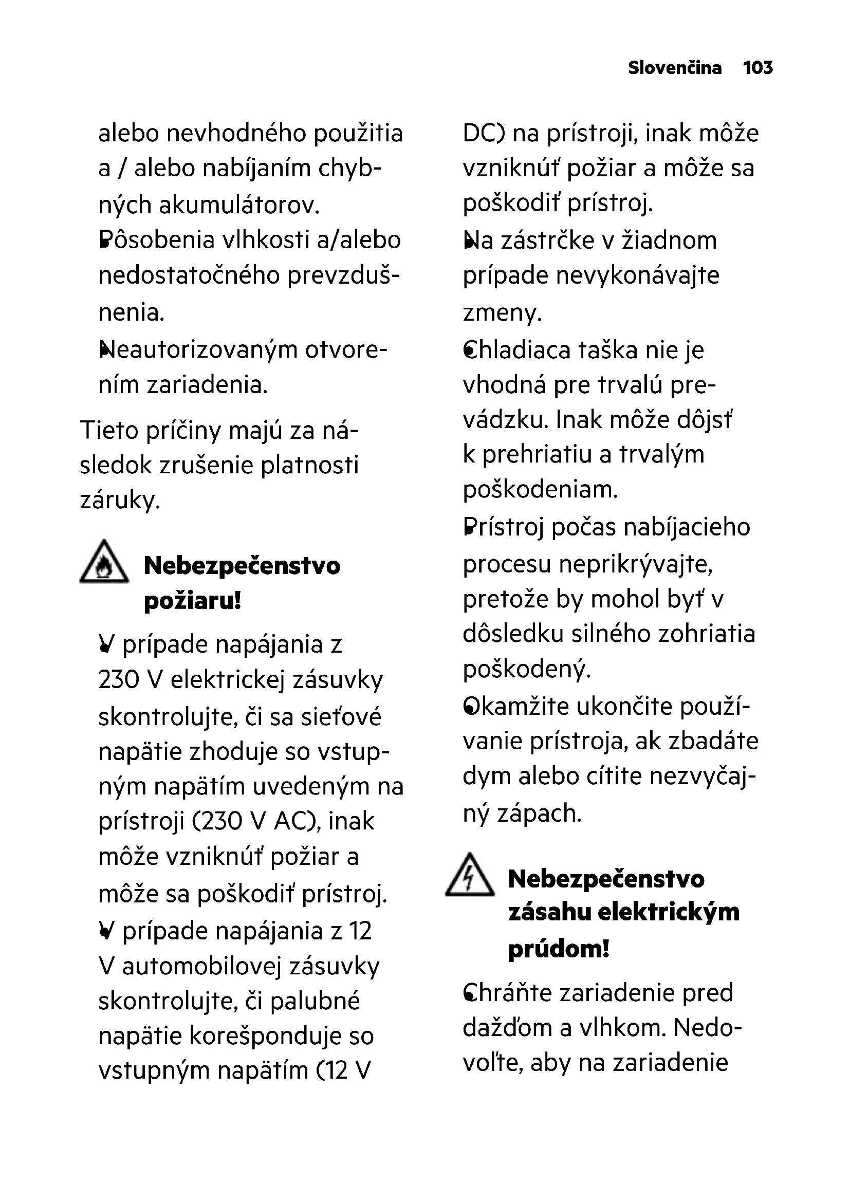 Neautorizovaným otvore- ním zariadenia. Tieto príčiny majú za ná- sledok zrušenie platnosti záruky. Nebezpečenstvo požiaru!