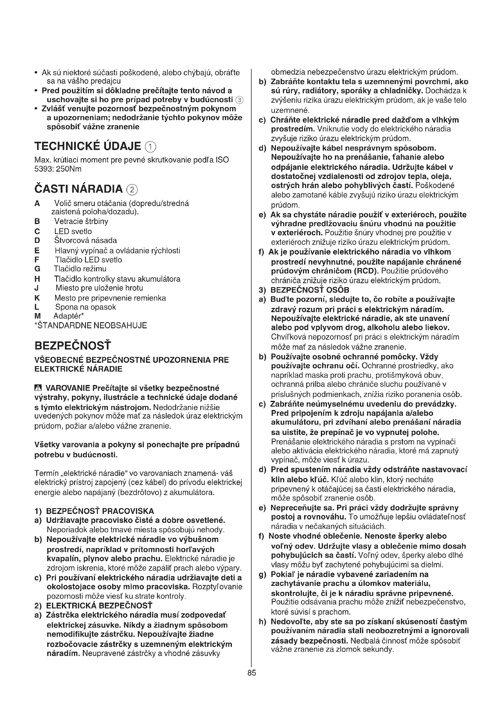 - Zvlášť venujte pozornosť bezpečnostným pokynom a upozorneniam; nedodržanie týchto pokynov môže spôsobiť vážne zranenie TECHNICKÉ ÚDAJE 1 Max. krútiaci moment pre pevné skrutkovanie podľa ISO 5393: 250Nm