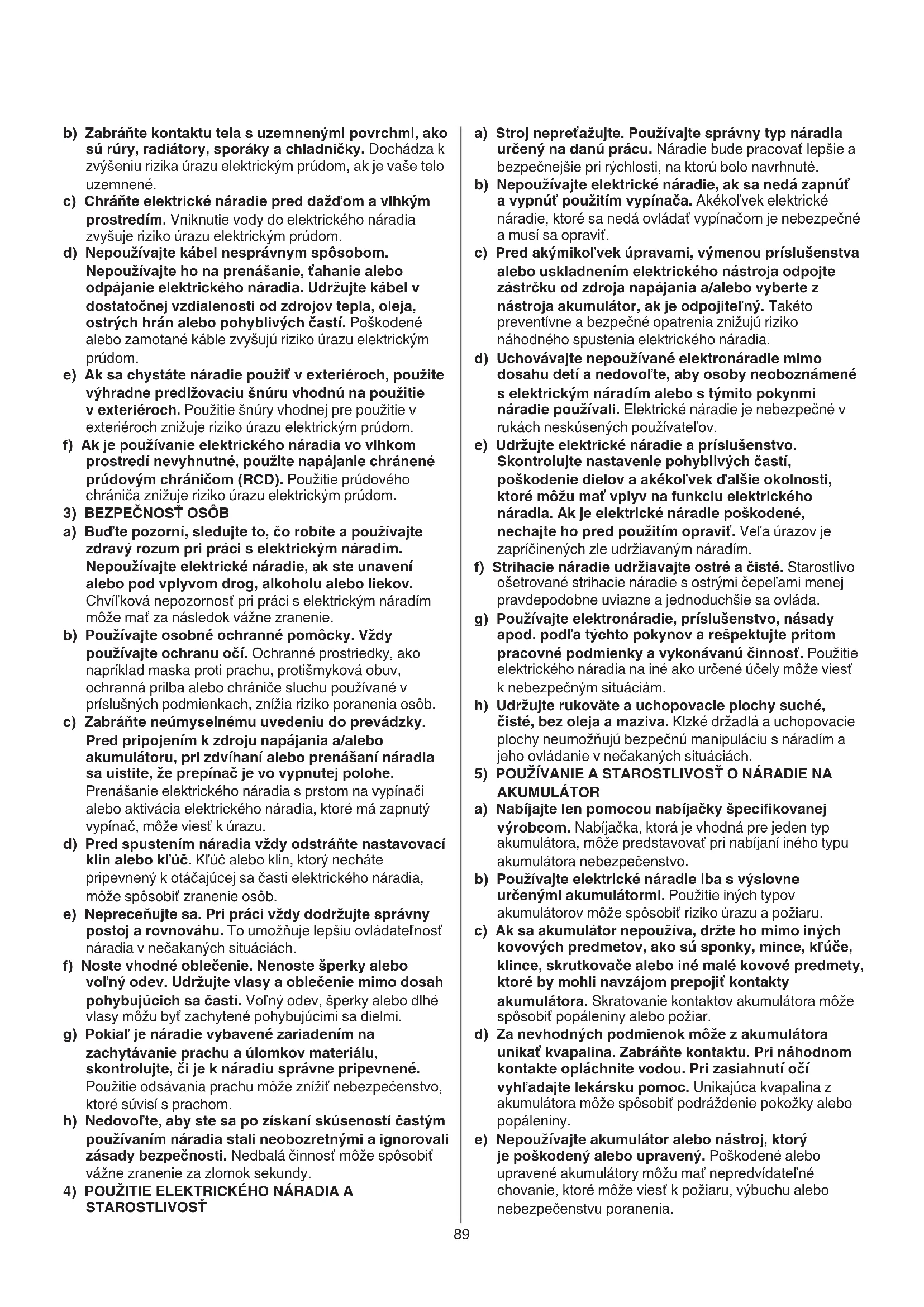 AKUMULÁTOR a) Nabíjajtelenpomocounabíjačkyšpecikovanej výrobcom. Nabíjačka, ktorá je vhodná pre jeden typ akumulátora, môže predstavovať pri nabíjaní iného typu akumulátora nebezpečenstvo. b) Používajteelektrickénáradieibasvýslovne určenýmiakumulátormi. Použitie iných typov akumulátorov môže spôsobiť riziko úrazu a požiaru. c) Aksaakumulátornepoužíva,držtehomimoiných kovovýchpredmetov,akosúsponky,mince,kľúče, klince,skrutkovačealeboinémalékovovépredmety, ktorébymohlinavzájomprepojiťkontakty akumulátora. Skratovanie kontaktov akumulátora môže spôsobiť popáleniny alebo požiar. d) Zanevhodnýchpodmienokmôžezakumulátora unikaťkvapalina.Zabráňtekontaktu.Prináhodnom kontakteopláchnitevodou.Prizasiahnutíočí vyhľadajtelekárskupomoc.Unikajúca kvapalina z akumulátora môže spôsobiť podráždenie pokožky alebo popáleniny. e) Nepoužívajteakumulátoralebonástroj,ktorý je poškodený alebo upravený. Poškodené alebo upravené akumulátory môžu mať nepredvídateľné chovanie, ktoré môže viesť k požiaru, výbuchu alebo nebezpečenstvu poranenia. b) Zabráňtekontaktutelasuzemnenýmipovrchmi,ako súrúry,radiátory,sporákyachladničky.Dochádza k zvýšeniu rizika úrazu elektrickým prúdom, ak je vaše telo uzemnené. c) Chráňteelektrickénáradiepreddažďomavlhkým prostredím. Vniknutie vody do elektrického náradia zvyšuje riziko úrazu elektrickým prúdom. d) Nepoužívajtekábelnesprávnymspôsobom. Nepoužívajtehonaprenášanie,ťahaniealebo odpájanieelektrickéhonáradia.Udržujtekábelv dostatočnejvzdialenostiodzdrojovtepla,oleja, ostrýchhránalebopohyblivýchčastí.Poškodené alebo zamotané káble zvyšujú riziko úrazu elektrickým prúdom. e) Aksachystátenáradiepoužiťvexteriéroch,použite výhradnepredlžovaciušnúruvhodnúnapoužitie v exteriéroch. Použitie šnúry vhodnej pre použitie v exteriéroch znižuje riziko úrazu elektrickým prúdom. f) Akjepoužívanieelektrickéhonáradiavovlhkom prostredínevyhnutné,použitenapájaniechránené prúdovýmchráničom(RCD). Použitie prúdového chrániča znižuje riziko úrazu elektrickým prúdom.