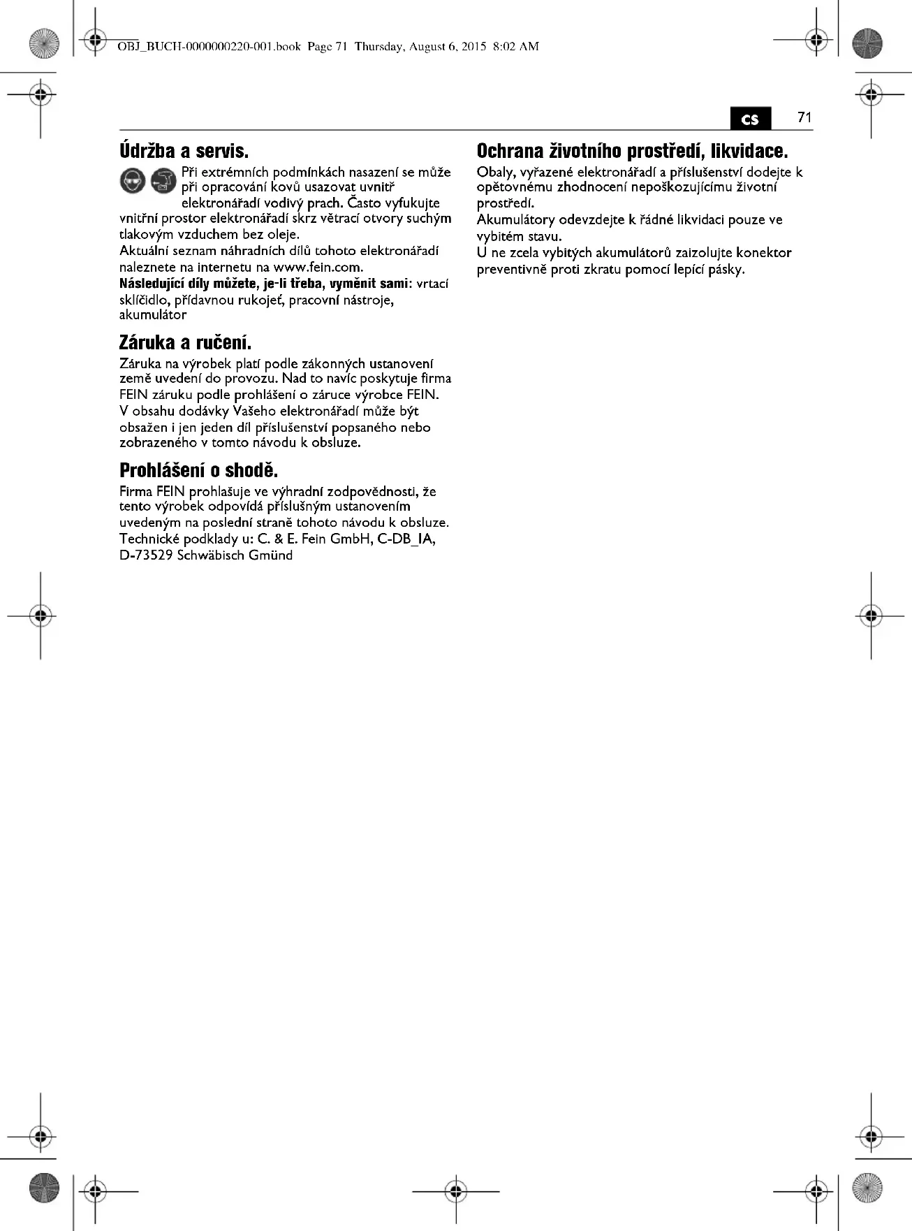 Je zakázané skrutkovať alebo nitovať na ručné elektrické náradie nejaké štítky alebo značky. Poškodená izolácia neposkytuje žiadnu ochranu pred zásahom elektrickým prúdom. Používajte samolepiace štítky. Nepoužívajte žiadne príslušenstvo, ktoré nebolo špeciálne vyvinuté alebo schválené výrobcom ručného elektrického náradia. Bezpečná prevádzka nie je zaručená iba tým, že sa určité príslušenstvo na Vaše ručné elektrické náradie hodí. Pravidelne čistite vetracie otvory ručného elektrického náradia pomocou nejakých nekovových nástrojov. Ventilátor elektromotora vťahuje do telesa náradia prach. V prípade nadmierneho nahromadenia kovového prachu to môže spôsobiť ohrozenie elektrickým prúdom. Používanie akumulátorov (akumulátorových blokov) a manipulácia s nimi. Aby ste sa pri zaobchádzaní s akumulátormi vyhli nebezpečenstvám ohrozenia zdravia ako popáleniny, požiar, výbuch, poranenia kože a iné poranenia, dodržiavajte nasledujúce pokyny: Akumulátory sa nesmú rozoberať, otvárať ani deliť na menšie kusy. Nevystavujte akumulátory žiadnym mechanickým nárazom. V prípade poškodenia alebo neodborného používania akumulátora môžu z neho vystupovať zdraviu škodlivé výpary alebo unikať kvapaliny. Tieto výpary môžu podráždiť dýchacie cesty. Unikajúca kvapalina z akumulátora môže mať za následok podráždenie pokožky alebo spôsobiť popáleniny. Ak kvapalina vytečená z akumulátora zasiahla aj okolité predmety a súčiastky, zasiahnuté súčiastky skontrolujte a v prípade potreby ich vyčistite alebo vymeňte. Nevystavujte akumulátor horúčave alebo ohňu. Neskladujte akumulátor na priamom slnečnom svetle. Akumulátor vyberte z originálneho obalu až vtedy, keď ho bude treba použiť. Pred každou prácou na ručnom elektrickom náradí vyberte z náradia akumulátor. Ak by sa ručné elektrické náradie nekontrolovane rozbehlo, hrozí nebezpečenstvo poranenia. Akumulátor vyberajte z ručného elektrického náradia iba vtedy, keď je náradie vypnuté. Akumulátory uschovávajte tak, aby k nim nemali prístup deti. Akumulátor udržiavajte v čistote a uschovávajte tak, aby bol chránený pred vlhkosťou a vodou. Znečistené prívody (kontakty) akumulátora a ručného elektrického náradia vyčistite suchou a čistou handričkou. Používajte len originálne akumulátory firmy FEIN, ktoré sú určené do Vášho ručného elektrického náradia. V prípade používania a nabíjania nevhodných, poškodených, opravovaných alebo upravovaných akumulátorov, rôznych napodobnenín alebo výrobkov iných firiem, hrozí nebezpečenstvo požiaru a/alebo výbuchu. Dodržiavajte bezpečnostné pokyny uvedené v Návode na používanie nabíjačky akumulátorov. Vibrácie ruky a predlaktia Úroveň vibrácií uvedená v týchto pokynoch bola nameraná podľa meracieho postupu uvedeného v norme EN 60745 a možno ju používať na vzájomné porovnávanie rôznych typov ručného elektrického náradia. Hodí sa aj na predbežný odhad zaťaženia vibráciami. Uvedená hladina zaťaženia vibráciami reprezentuje hlavné druhy používania tohto ručného elektrického náradia. Avšak v takých prípadoch, keď sa toto ručné elektrické náradie využíva na iné druhy použitia, s odlišnými pracovnými nástrojmi, alebo ak sa podrobuje nedostatočnej údržbe, môže sa hladina zaťaženia vibráciami od týchto hodnôt odlišovať. To môže výrazne zvýšiť zaťaženie vibráciami počas celej pracovnej doby. Na presný odhad zaťaženia vibráciami počas určitého časového úseku práce s náradím treba zohľadniť doby, počas ktorých je ručné elektrické náradie vypnuté alebo doby, keď je náradie síce zapnuté a beží, ale v skutočnosti nepracuje. Táto okolnosť môže výrazne redukovať zaťaženie vibráciami počas celej pracovnej doby. Na ochranu osoby pracujúcej s náradím pred účinkami zaťaženia vibráciami vykonajte ďalšie bezpečnostné opatrenia, ako sú napríklad: Údržba ručného elektrického náradia a používaných pracovných nástrojov, zabezpečenie zachovania teploty rúk, organizácia jednotlivých pracovných úkonov. Zaobchádzanie so zdraviu škodlivým prachom Pri pracovných činnostiach s týmto náradím, pri ktorých dochádza k úberu materiálu, vzniká prach, ktorý môže byť zdraviu škodlivý. Dotyk alebo vdychovanie niektorých druhov prachu, napr. z azbestu a z materiálov obsahujúcich azbest, z náteru obsahujúceho olovo, z kovov, niektorých druhov dreva, minerálov, silikátových častíc materiálov obsahujúcich kamenivo, z rozpúšťadiel farieb, z prostriedkov na ochranu dreva, z ochranných náterov pre vodné dopravné prostriedky môže vyvolať u niektorých osôb alergické reakcie a/alebo spôsobiť ochorenie dýchacích ciest, rakovinu a vyvolávať poruchy plodnosti. Riziko vyvolané nadýchaním sa prachu je závislé od doby zotrvania v ohrozenom priestore. Používajte odsávacie zariadenie zodpovedajúce vznikajúcemu druhu prachu ako aj osobné ochranné pomôcky a postarajte sa o dobré vetranie pracoviska. Obrábanie materiálov, ktoré obsahujú azbest, prenechajte výlučne na odborníkov. Drevený prach, prach z ľahkých kovov, horúce zmesi brúsneho prachu a chemických látok sa môžu za nepriaznivých podmienok samovznietiť, alebo môžu spôsobiť výbuch. Vyhýbajte sa tomu, aby prúd iskier smeroval k zásobníku na prach, a zabráňte prehrievaniu ručného elektrického náradia a brúseného materiálu, zavčasu vyprázdňujte zásobník na prach, dodržiavajte pokyny výrobcu materiálu aj predpisy o obrábaní príslušného materiálu platné vo Vašej krajine. OBJ_BUCH-0000000220-001.book Page 74 Thursday, August 6, 2015 8:02 AM75
