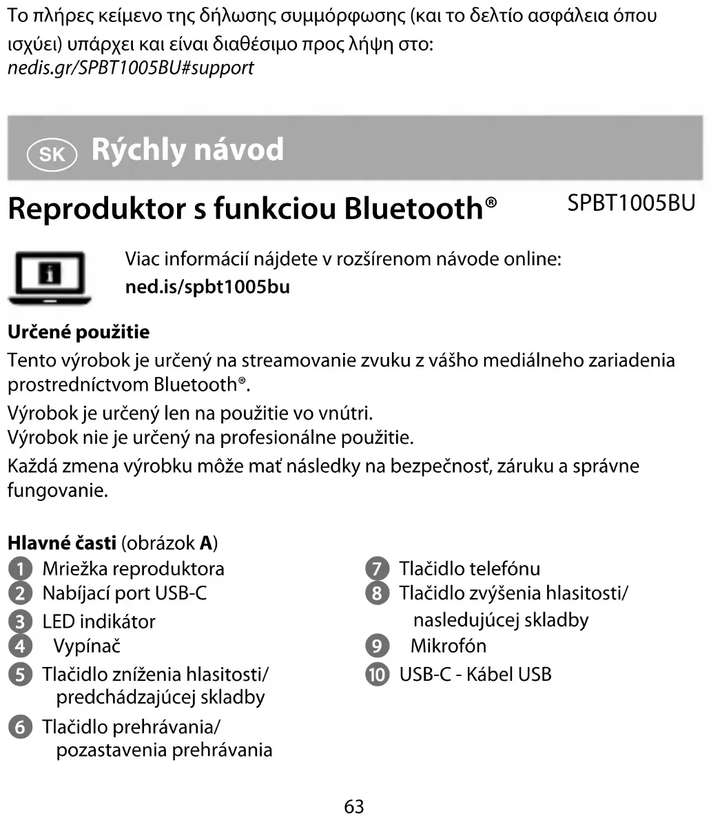 Rýchly návod Reproduktor s funkciou Bluetooth® SPBT1005BU Viac informácií nájdete v rozšírenom návode online: ned.is/spbt1005bu Určené použitie Tento výrobok je určený na streamovanie zvuku z vášho mediálneho zariadenia prostredníctvom Bluetooth®. Výrobok je určený len na použitie vo vnútri. Výrobok nie je určený na profesionálne použitie. Každá zmena výrobku môže mať následky na bezpečnosť, záruku a správne fungovanie. Hlavné časti (obrázok A) 1 Mriežka reproduktora 2 Nabíjací port USB-C 3 LED indikátor 4 Vypínač 5 Tlačidlo zníženia hlasitosti/ predchádzajúcej skladby 6 Tlačidlo prehrávania/ pozastavenia prehrávania 7 Tlačidlo telefónu 8 Tlačidlo zvýšenia hlasitosti/ nasledujúcej skladby 9 Mikrofón q USB-C - Kábel USB64 Bezpečnostné pokyny
