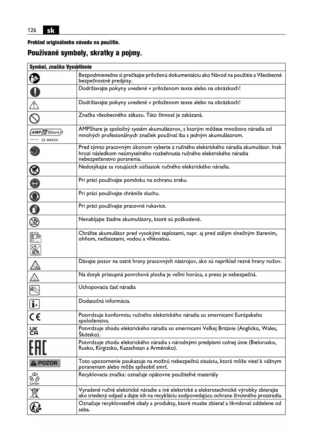 Preklad originálneho návodu na použitie. Používané symboly, skratky a pojmy. Symbol, značka Vysvetlenie Bezpodmienečne si prečítajte priloženú dokumentáciu ako Návod na použitie a Všeobecné bezpečnostné predpisy. Dodržiavajte pokyny uvedené v priloženom texte alebo na obrázkoch! Dodržiavajte pokyny uvedené v priloženom texte alebo na obrázkoch! Značka všeobecného zákazu. Táto činnosť je zakázaná. AMPShare je spoločný systém akumulátorov, s ktorým môžete množstvo náradia od mnohých profesionálnych značiek používať iba s jedným akumulátorom. Pred týmto pracovným úkonom vyberte z ručného elektrického náradia akumulátor. Inak hrozí následkom neúmyselného rozbehnutia ručného elektrického náradia nebezpečenstvo poranenia. Nedotýkajte sa rotujúcich súčiastok ručného elektrického náradia. Pri práci používajte pomôcku na ochranu zraku. Pri práci používajte chrániče sluchu. Pri práci používajte pracovné rukavice. Nenabíjajte žiadne akumulátory, ktoré sú poškodené. Chráňte akumulátor pred vysokými teplotami, napr. aj pred stálym slnečným žiarením, ohňom, nečistotami, vodou a vlhkosťou. Dávajte pozor na ostré hrany pracovných nástrojov, ako sú napríklad rezné hrany nožov. Na dotyk prístupná povrchová plocha je veľmi horúca, a preto je nebezpečná. Uchopovacia časť náradia Dodatočná informácia. Potvrdzuje konformitu ručného elektrického náradia so smernicami Európskeho spoločenstva. Potvrdzuje zhodu elektrického náradia so smernicami Veľkej Británie (Anglicko, Wales, Škótsko). Potvrdzuje zhodu elektrického náradia s národnými predpismi colnej únie (Bielorusko, Rusko, Kirgizsko, Kazachstan a Arménsko). Toto upozornenie poukazuje na možnú nebezpečnú situáciu, ktorá môže viesť k vážnym poraneniam alebo môže spôsobiť smrť. Recyklovacia značka: označuje opätovne použiteľné materiály Vyradené ručné elektrické náradie a iné elektrické a elektrotechnické výrobky zbierajte ako triedený odpad a dajte ich na recykláciu zodpovedajúcu ochrane životného prostredia. Označuje recyklovateľné obaly a produkty, ktoré musíte zbierať a likvidovať oddelene od seba. max.50°C127