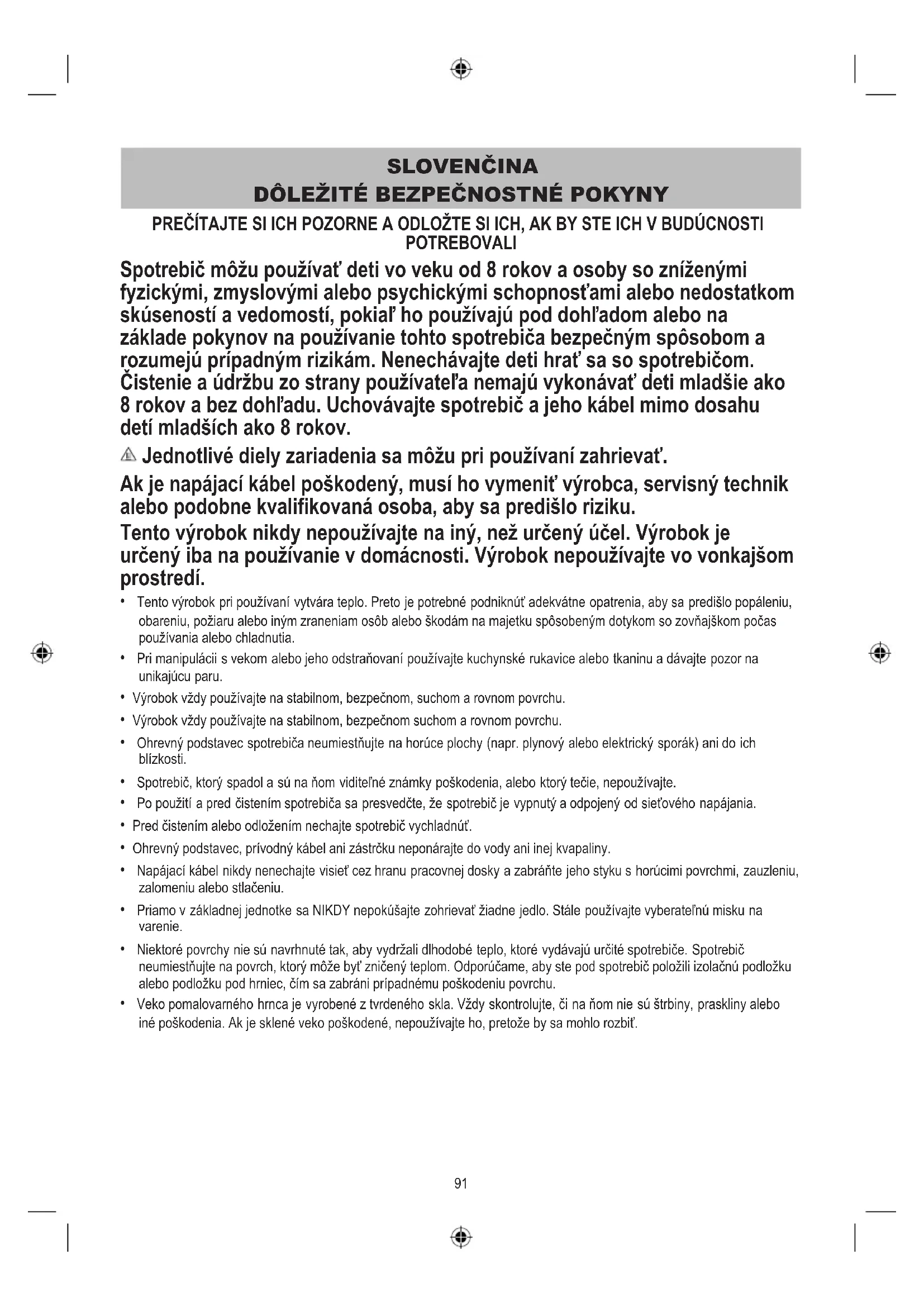 PREČÍTAJTE SI ICH POZORNE A ODLOŽTE SI ICH, AK BY STE ICH V BUDÚCNOSTI POTREBOVALI Spotrebič môžu používať deti vo veku od 8 rokov a osoby so zníženými fyzickými, zmyslovými alebo psychickými schopnosťami alebo nedostatkom skúseností a vedomostí, pokiaľ ho používajú pod dohľadom alebo na základe pokynov na používanie tohto spotrebiča bezpečným spôsobom a rozumejú prípadným rizikám. Nenechávajte deti hrať sa so spotrebičom. Čistenie a údržbu zo strany používateľa nemajú vykonávať deti mladšie ako 8 rokov a bez dohľadu. Uchovávajte spotrebič a jeho kábel mimo dosahu detí mladších ako 8 rokov. Jednotlivé diely zariadenia sa môžu pri používaní zahrievať. Ak je napájací kábel poškodený, musí ho vymeniť výrobca, servisný technik alebo podobne kvalifikovaná osoba, aby sa predišlo riziku. Tento výrobok nikdy nepoužívajte na iný, než určený účel. Výrobok je určený iba na používanie v domácnosti. Výrobok nepoužívajte vo vonkajšom prostredí.