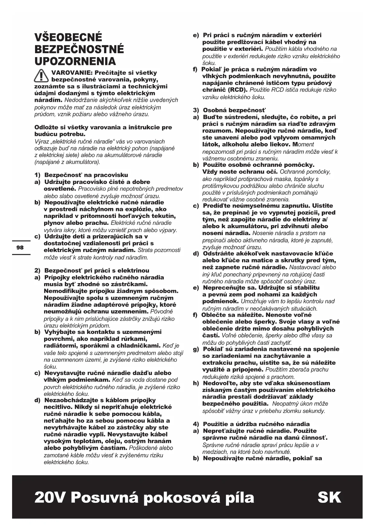 VŠEOBECNÉ BEZPEČNOSTNÉ UPOZORNENIA VAROVANIE: Prečítajte si všetky bezpečnostné varovania, pokyny, zoznámte sa s ilustráciami a technickými údajmi dodanými s týmto elektrickým náradím. Nedodržanie akýchkoľvek nižšie uvedených pokynov môže mať za následok úraz elektrickým prúdom, vznik požiaru alebo vážneho úrazu. Odložte si všetky varovania a inštrukcie pre budúcu potrebu. Výraz „elektrické ručné náradie“ vás vo varovaniach odkazuje buď na náradie na elektrický pohon (napájané z elektrickej siete) alebo na akumulátorové náradie (napájané z akumulátora).