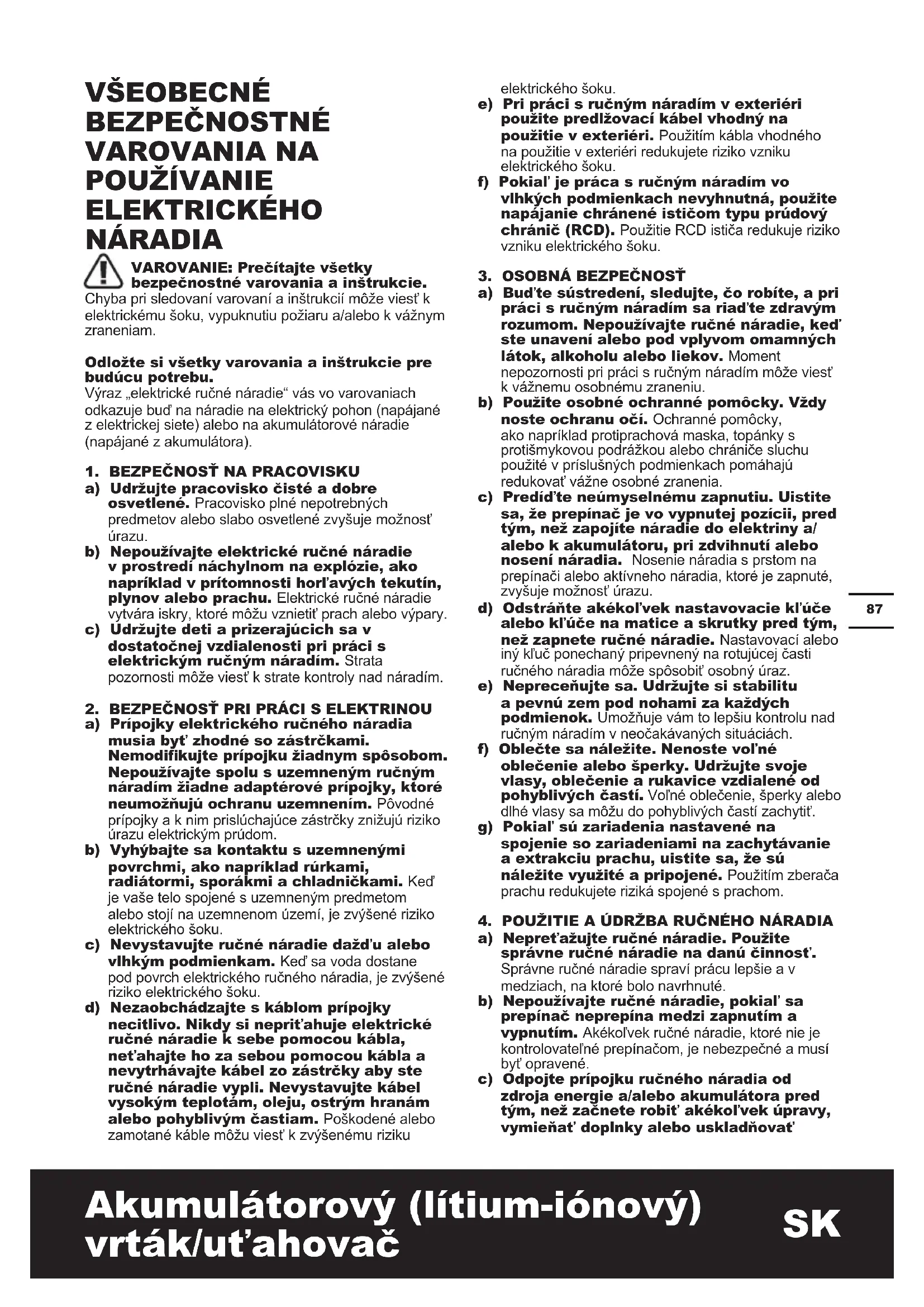 a) Nepreťažujte ručné náradie. Použite správne ručné náradie na danú činnosť. Správne ručné náradie spraví prácu lepšie a v medziach, na ktoré bolo navrhnuté. b) Nepoužívajte ručné náradie, pokiaľ sa prepínač neprepína medzi zapnutím a vypnutím. Akékoľvek ručné náradie, ktoré nie je kontrolovateľné prepínačom, je nebezpečné a musí byť opravené. c) Odpojte prípojku ručného náradia od zdroja energie a/alebo akumulátora pred tým, než začnete robiť akékoľvek úpravy, vymieňať doplnky alebo uskladňovať88 Akumulátorový (lítium-iónový) vrták/uťahovač