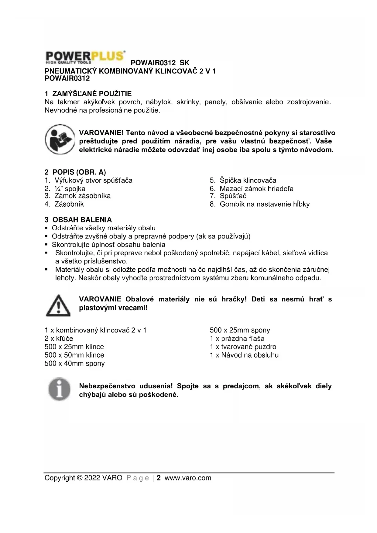 - Materiály obalu si odložte podľa možnosti na čo najdlhší čas, až do skončenia záručnej lehoty. Neskôr obaly vyhoďte prostredníctvom systému zberu komunálneho odpadu. VAROVANIE Obalové materiály nie sú hračky! Deti sa nesmú hrať s plastovými vrecami! 1 x kombinovaný klincovač 2 v 1 2 x kľúče 500 x 25mm klince 500 x 50mm klince 500 x 40mm spony 500 x 25mm spony 1 x prázdna fľaša 1 x tvarované puzdro 1 x Návod na obsluhu Nebezpečenstvo udusenia! Spojte sa s predajcom, ak akékoľvek diely chýbajú alebo sú poškodené.POWAIR0312 SK Copyright © 2022 VARO P a g e | 3 www.varo.com 4 SYMBOLY V tomto návode a/alebo na stroji sa používajú nasledujúce symboly: