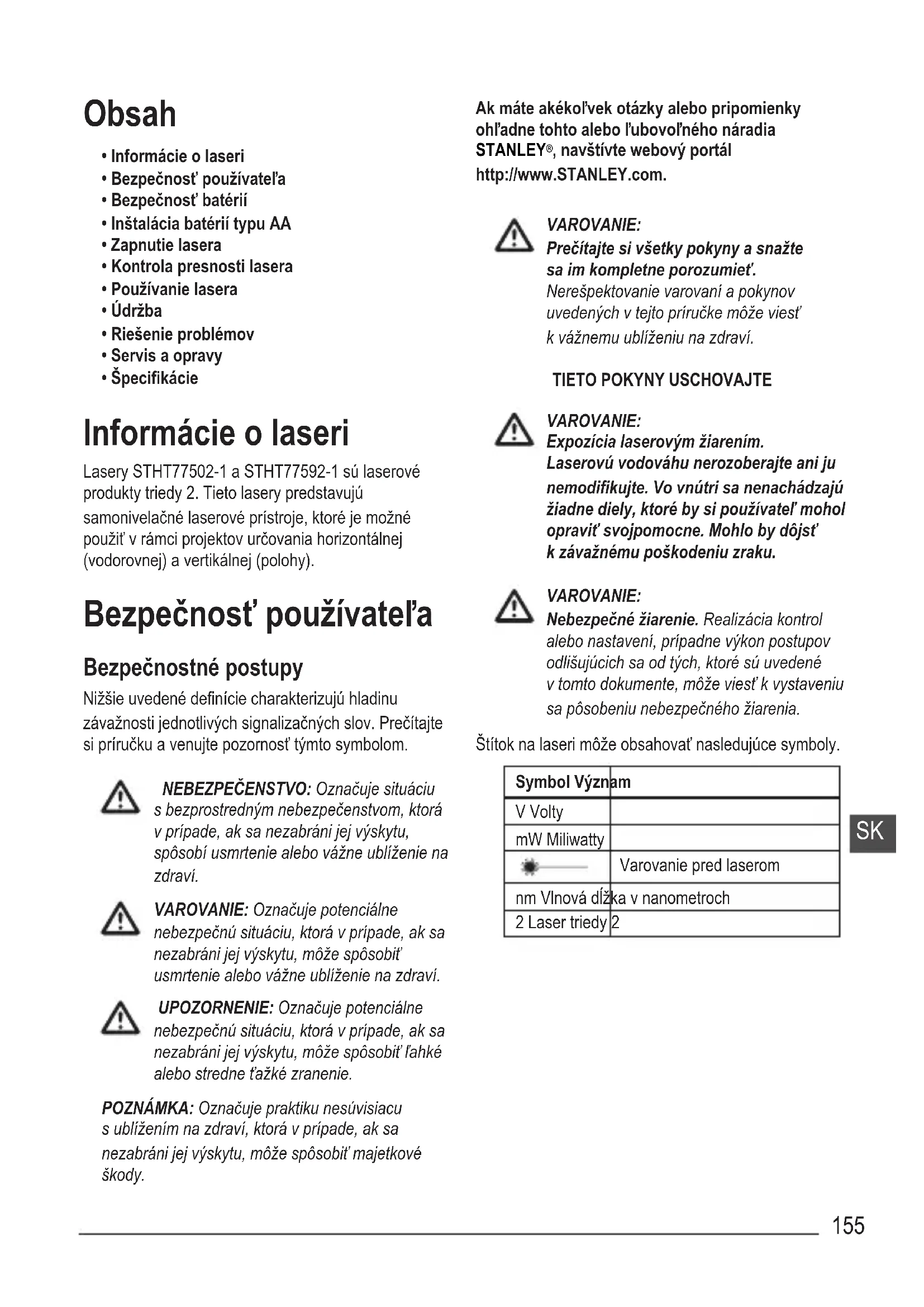 - Špecikácie Informácie o laseri Lasery STHT77502-1 a STHT77592-1 sú laserové produkty triedy 2. Tieto lasery predstavujú samonivelačné laserové prístroje, ktoré je možné použiť v rámci projektov určovania horizontálnej (vodorovnej) a vertikálnej (polohy). Bezpečnosť používateľa Bezpečnostné postupy Nižšie uvedené denície charakterizujú hladinu závažnosti jednotlivých signalizačných slov. Prečítajte si príručku a venujte pozornosť týmto symbolom. NEBEZPEČENSTVO: Označuje situáciu s bezprostredným nebezpečenstvom, ktorá v prípade, ak sa nezabráni jej výskytu, spôsobí usmrtenie alebo vážne ublíženie na zdraví. VAROVANIE: Označuje potenciálne nebezpečnú situáciu, ktorá v prípade, ak sa nezabráni jej výskytu, môže spôsobiť usmrtenie alebo vážne ublíženie na zdraví. UPOZORNENIE: Označuje potenciálne nebezpečnú situáciu, ktorá v prípade, ak sa nezabráni jej výskytu, môže spôsobiť ľahké alebo stredne ťažké zranenie. POZNÁMKA: Označuje praktiku nesúvisiacu s ublížením na zdraví, ktorá v prípade, ak sa nezabráni jej výskytu, môže spôsobiť majetkové škody. Ak máte akékoľvek otázky alebo pripomienky ohľadne tohto alebo ľubovoľného náradia STANLEY