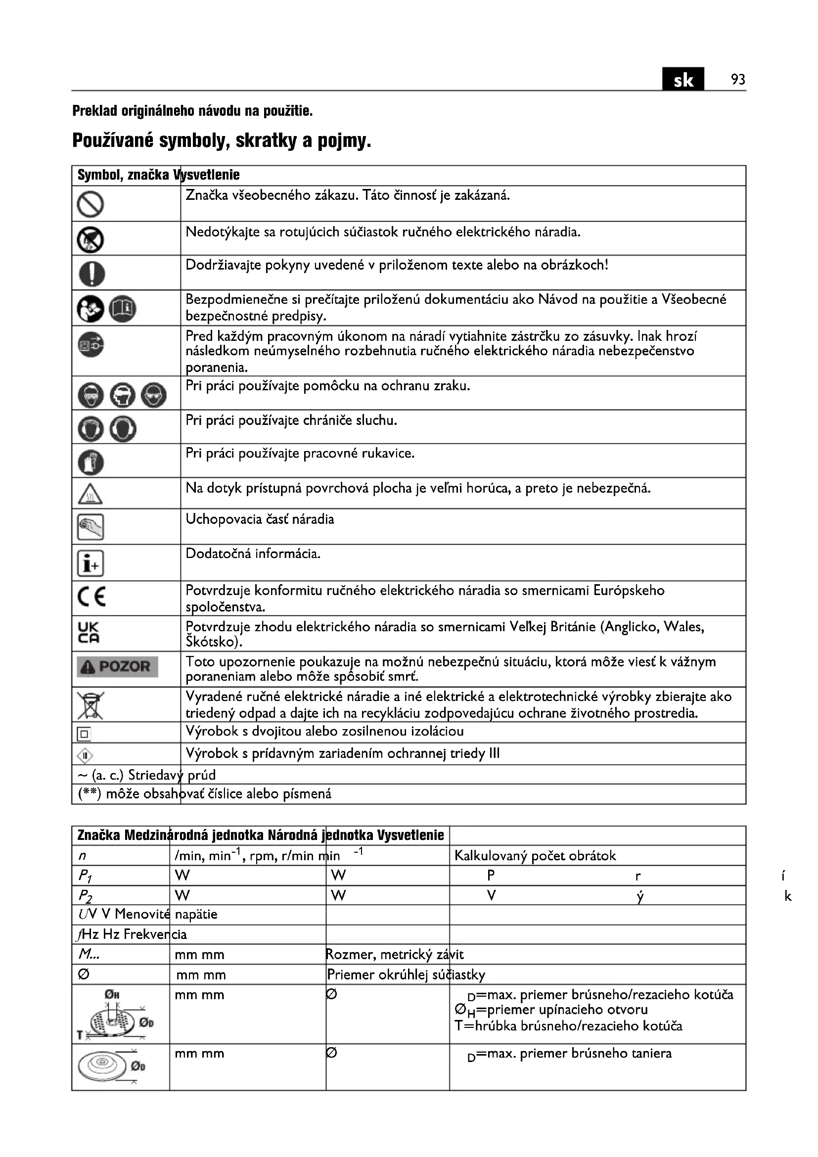 Preklad originálneho návodu na použitie. Používané symboly, skratky a pojmy. Symbol, značka Vysvetlenie Značka všeobecného zákazu. Táto činnosť je zakázaná. Nedotýkajte sa rotujúcich súčiastok ručného elektrického náradia. Dodržiavajte pokyny uvedené v priloženom texte alebo na obrázkoch! Bezpodmienečne si prečítajte priloženú dokumentáciu ako Návod na použitie a Všeobecné bezpečnostné predpisy. Pred každým pracovným úkonom na náradí vytiahnite zástrčku zo zásuvky. Inak hrozí následkom neúmyselného rozbehnutia ručného elektrického náradia nebezpečenstvo poranenia. Pri práci používajte pomôcku na ochranu zraku. Pri práci používajte chrániče sluchu. Pri práci používajte pracovné rukavice. Na dotyk prístupná povrchová plocha je veľmi horúca, a preto je nebezpečná. Uchopovacia časť náradia Dodatočná informácia. Potvrdzuje konformitu ručného elektrického náradia so smernicami Európskeho spoločenstva. Potvrdzuje zhodu elektrického náradia so smernicami Veľkej Británie (Anglicko, Wales, Škótsko). Toto upozornenie poukazuje na možnú nebezpečnú situáciu, ktorá môže viesť k vážnym poraneniam alebo môže spôsobiť smrť. Vyradené ručné elektrické náradie a iné elektrické a elektrotechnické výrobky zbierajte ako triedený odpad a dajte ich na recykláciu zodpovedajúcu ochrane životného prostredia. Výrobok s dvojitou alebo zosilnenou izoláciou Výrobok s prídavným zariadením ochrannej triedy III ~ (a. c.) Striedavý prúd (**) môže obsahovať číslice alebo písmená Značka Medzinárodná jednotka Národná jednotka Vysvetlenie