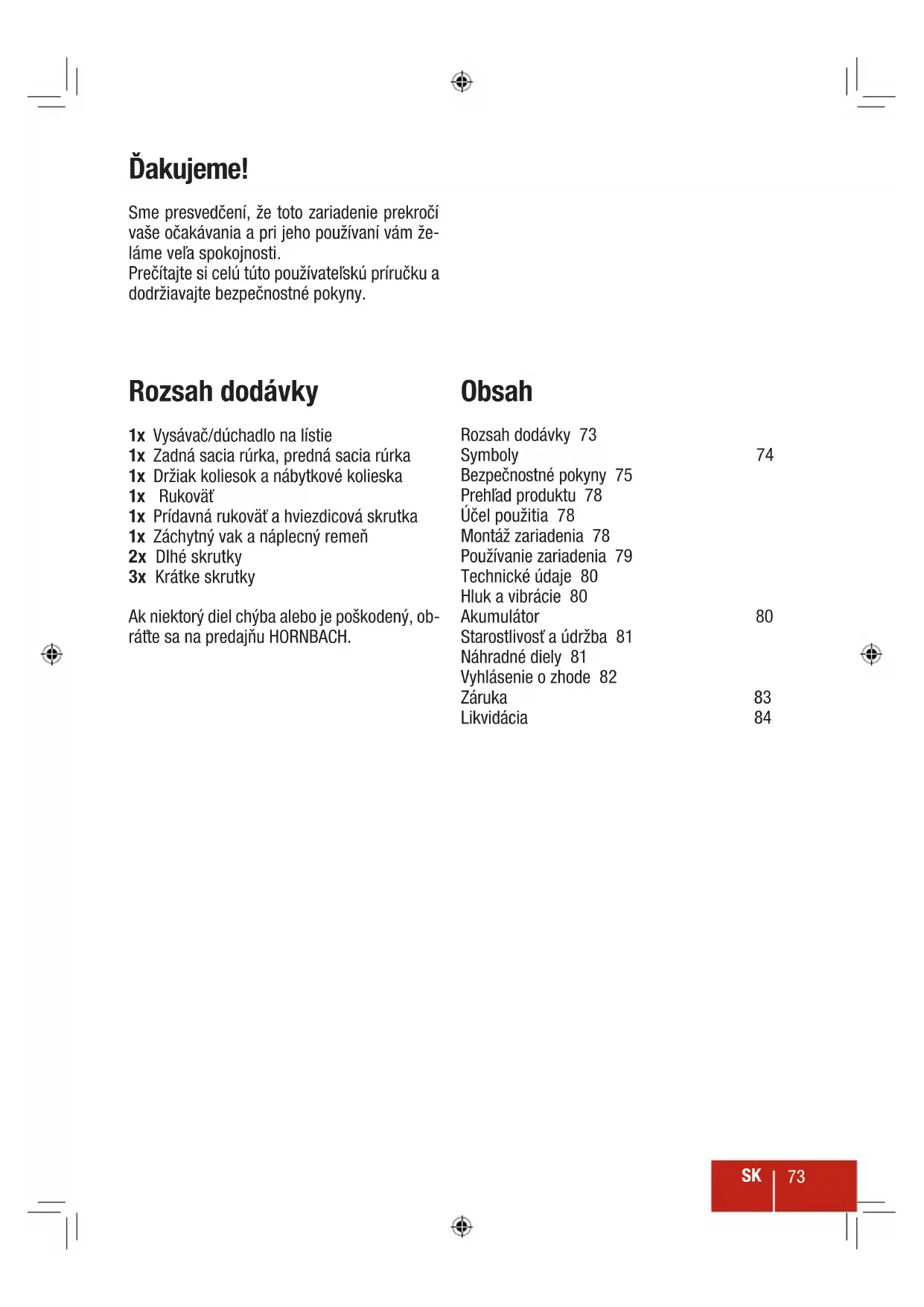 Ďakujeme! Sme presvedčení, že toto zariadenie prekročí vaše očakávania a pri jeho používaní vám že- láme veľa spokojnosti. Prečítajte si celú túto používateľskú príručku a dodržiavajte bezpečnostné pokyny. Rozsah dodávky 1x Vysávač/dúchadlo na lístie 1x Zadná sacia rúrka, predná sacia rúrka 1x Držiak koliesok a nábytkové kolieska 1x Rukoväť 1x Prídavná rukoväť a hviezdicová skrutka 1x Záchytný vak a náplecný remeň 2x Dlhé skrutky 3x Krátke skrutky Ak niektorý diel chýba alebo je poškodený, ob- ráťte sa na predajňu HORNBACH. Obsah Rozsah dodávky 73 Symboly 74 Bezpečnostné pokyny 75 Prehľad produktu 78 Účel použitia 78 Montáž zariadenia 78 Používanie zariadenia 79 Technické údaje 80 Hluk a vibrácie 80 Akumulátor 80 Starostlivosť a údržba 81 Náhradné diely 81 Vyhlásenie o zhode 82 Záruka 83 Likvidácia 84SK