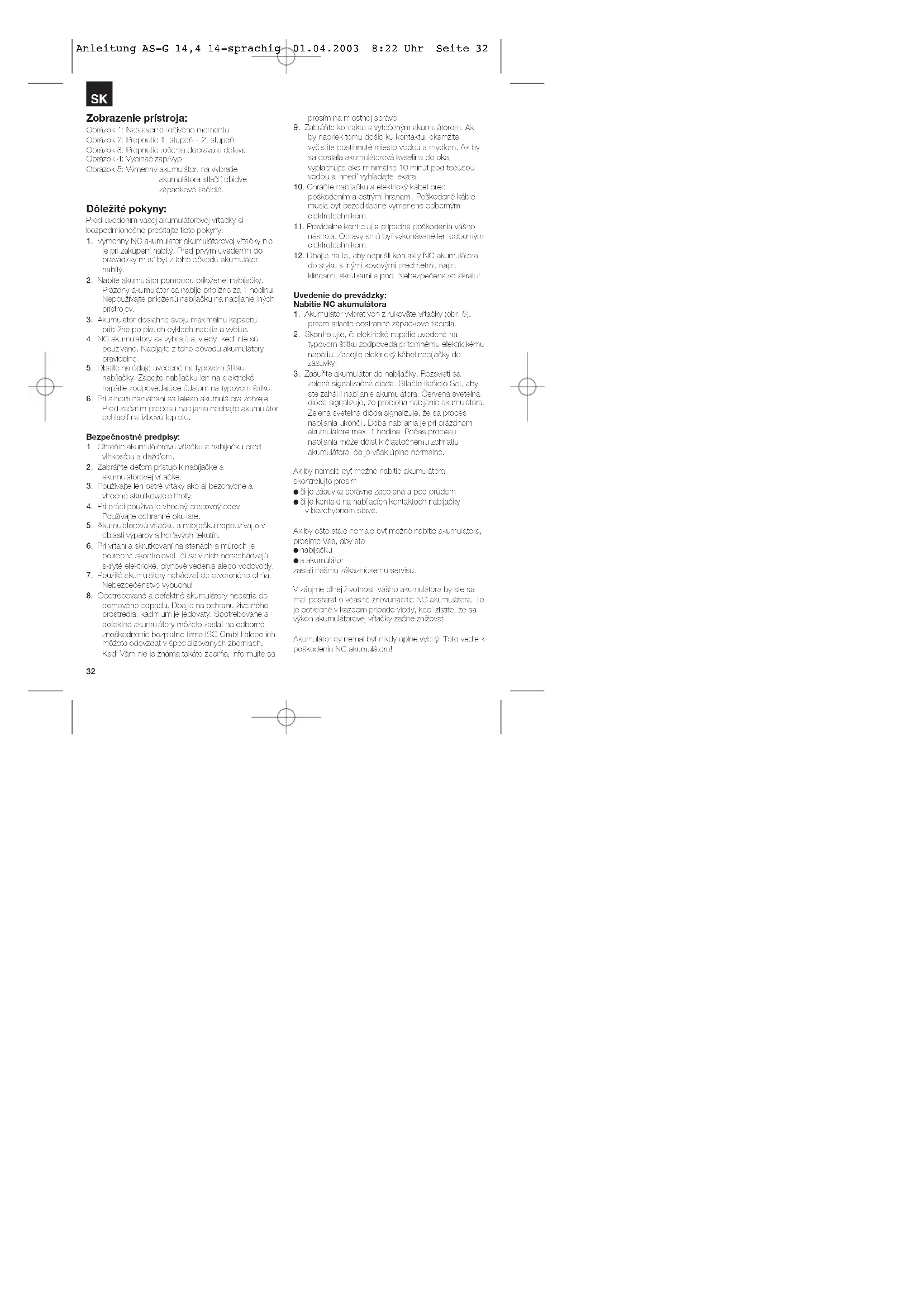 zelená signalizačná dióda. Stlačte tlačidlo Set, aby ste zahájili nabíjanie akumulátora. Červená svetelná dióda signalizuje, že prebieha nabíjanie akumulátora. Zelená svetelná dióda signalizuje, že sa proces nabíjania ukončil. Doba nabíjania je pri prázdnom akumulátore max. 1 hodina. Počas procesu nabíjania môže dôjsť k čiastočnému zohriatiu akumulátora, čo je však úplne normálne. Ak by nemalo byť možné nabitie akumulátora, skontrolujte prosím či je zásuvka správne zapojená a pod prúdom či je kontakt na nabíjacích kontaktoch nabíjačky v bezchybnom stave. Ak by ešte stále nemalo byť možné nabitie akumulátora, prosíme Vás, aby ste nabíjačku a akumulátor zaslali nášmu zákazníckemu servisu. V záujme dlhej životnosti vášho akumulátora by ste sa mali postarať o včasné znovunabitie NC akumulátora. To je potrebné v každom prípade vledy, ked’ zlstíte, že sa výkon akumulátorovej vŕtačky začne znižovať. Akumulátor by nemal byť nikdy úplne vybitý. Toto vedie k poškodeniu NC akumulátoru! Anleitung AS-G 14,4 14-sprachig 01.04.2003 8:22 Uhr Seite 3233