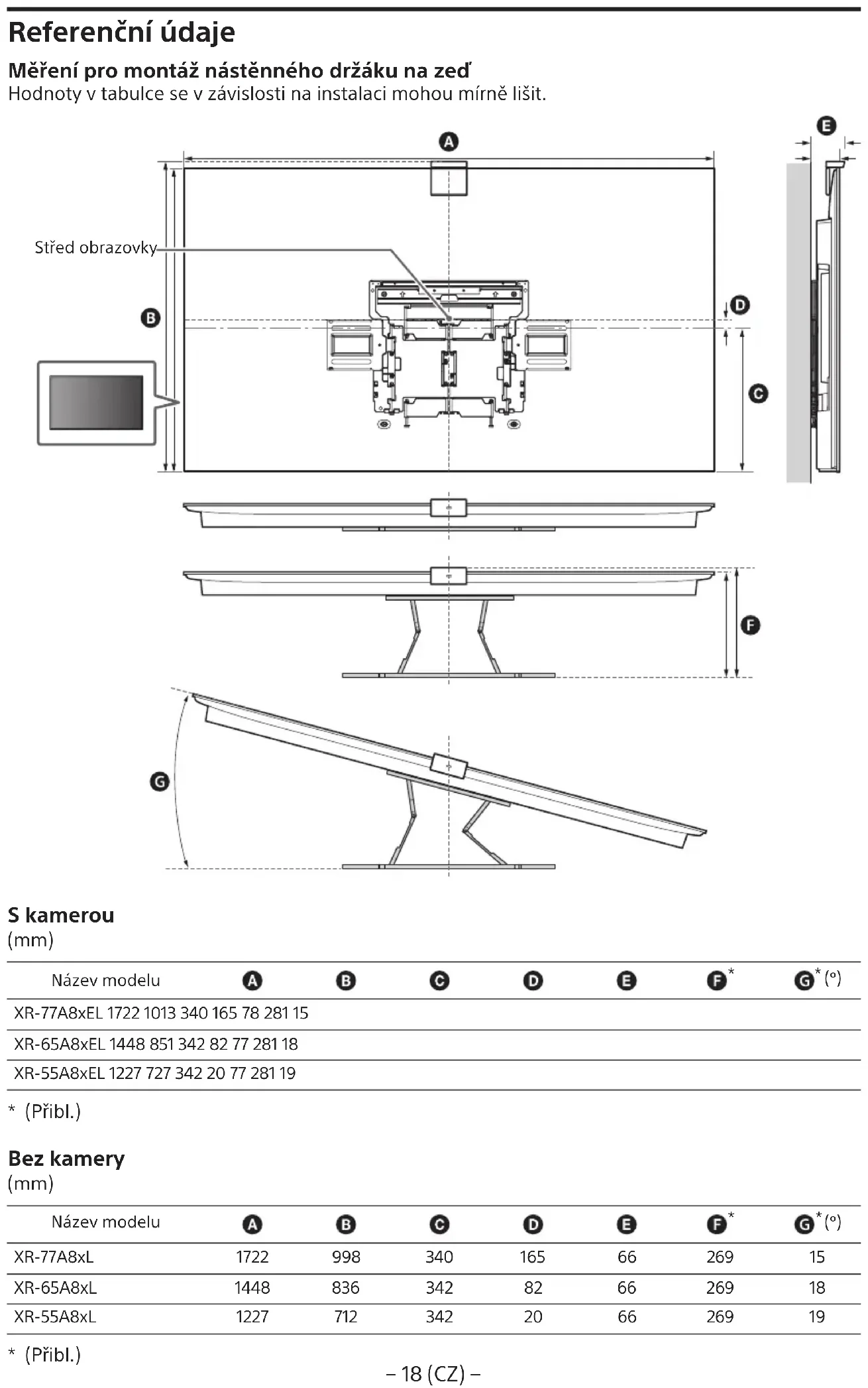 - V názvoch modelov označujú znaky „x“/„xx“ čísla alebo znaky špecifické pre jednotlivé modely. XR-77A8xL / 77A8xEL / 65A8xL / 65A8xEL / 55A8xL / 55A8xEL Pre zákazníkov Z dôvodov ochrany produktu a bezpečnosti spoločnosť Sony odporúča, aby inštaláciu televízneho prijímača vykonali predajcovia spoločnosti Sony alebo licencovaní dodávatelia. Nepokúšajte sa ho nainštalovať sami. Pre predajcov a dodávateľov spoločnosti Sony Počas inštalácie, pravidelnej údržby a kontroly tohto produktu venujte plnú pozornosť bezpečnosti. Inštalácia tohto produktu vyžaduje adekvátne odborné znalosti. Obzvlášť je potrebné určiť, či je stena dostatočne pevná na to, aby udržala hmotnosť televízneho prijímača. Pripevnenie tohto produktu na stenu zverte predajcom alebo licencovaným dodávateľom spoločnosti Sony a počas inštalácie venujte náležitú pozornosť bezpečnosti. Spoločnosť Sony nezodpovedá za žiadne škody ani zranenia spôsobené nevhodnou manipuláciou alebo nesprávnou inštaláciou. Pre bezpečnosť a správnu inštaláciu postupujte podľa návodu na obsluhu montážnej konzoly na stenu, sprievodcu nastavením televízneho prijímača a podľa pokynov v tomto návode.− 3 (SK) −