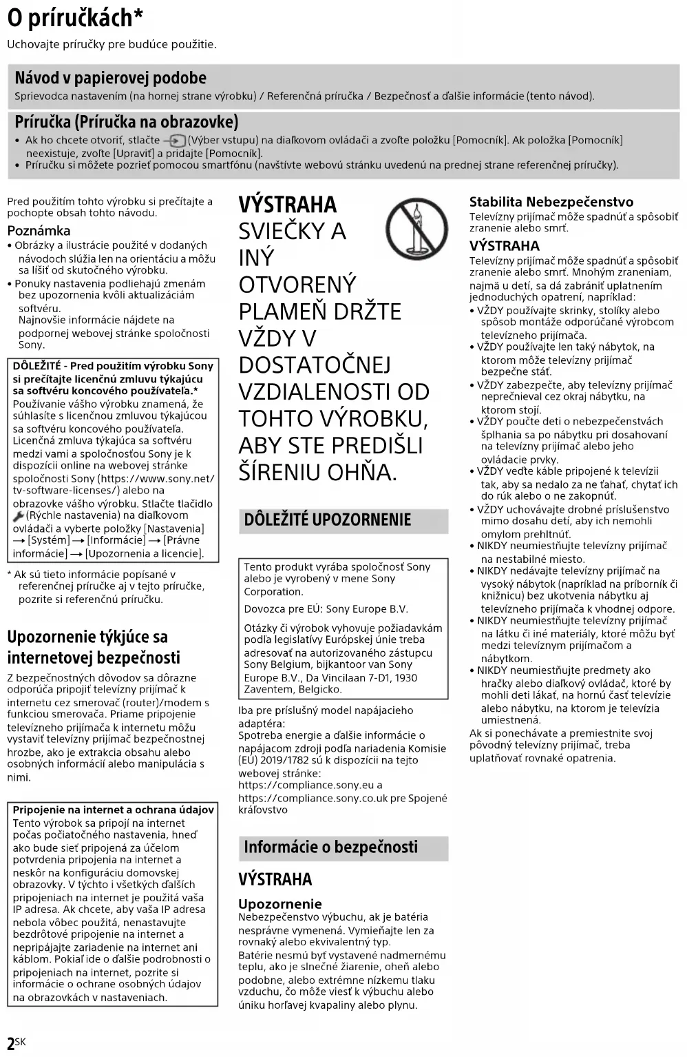 ŠÍRENIU OHŇA. Iba pre príslušný model napájacieho adaptéra:Spotreba energie a ďalšie informácie o napájacom zdroji podľa nariadenia Komisie (EÚ) 2019/1782 sú k dispozícii na tejto webovej stránke:https://compliance.sony.eu ahttps://compliance.sony.co.uk pre Spojené kráľovstvo VÝSTRAHA Upozornenie Nebezpečenstvo výbuchu, ak je batéria nesprávne vymenená. Vymieňajte len za rovnaký alebo ekvivalentný typ.Batérie nesmú byť vystavené nadmernému teplu, ako je slnečné žiarenie, oheň alebo podobne, alebo extrémne nízkemu tlaku vzduchu, čo môže viesť k výbuchu alebo úniku horľavej kvapaliny alebo plynu. Stabilita Nebezpečenstvo Televízny prijímač môže spadnúť a spôsobiť zranenie alebo smrť. VÝSTRAHA Televízny prijímač môže spadnúť a spôsobiť zranenie alebo smrť. Mnohým zraneniam, najmä u detí, sa dá zabrániť uplatnením jednoduchých opatrení, napríklad:• VŽDY používajte skrinky, stolíky alebo spôsob montáže odporúčané výrobcom televízneho prijímača.• VŽDY používajte len taký nábytok, na ktorom môže televízny prijímač bezpečne stáť.• VŽDY zabezpečte, aby televízny prijímač neprečnieval cez okraj nábytku, na ktorom stojí.• VŽDY poučte deti o nebezpečenstvách šplhania sa po nábytku pri dosahovaní na televízny prijímač alebo jeho ovládacie prvky.• VŽDY veďte káble pripojené k televízii tak, aby sa nedalo za ne ťahať, chytať ich do rúk alebo o ne zakopnúť.• VŽDY uchovávajte drobné príslušenstvo mimo dosahu detí, aby ich nemohli omylom prehltnúť.• NIKDY neumiestňujte televízny prijímač na nestabilné miesto.• NIKDY nedávajte televízny prijímač na vysoký nábytok (napríklad na príborník či knižnicu) bez ukotvenia nábytku aj televízneho prijímača k vhodnej odpore.• NIKDY neumiestňujte televízny prijímač na látku či iné materiály, ktoré môžu byť medzi televíznym prijímačom a nábytkom.• NIKDY neumiestňujte predmety ako hračky alebo diaľkový ovládač, ktoré by mohli deti lákať, na hornú časť televízie alebo nábytku, na ktorom je televízia umiestnená.Ak si ponechávate a premiestnite svoj pôvodný televízny prijímač, treba uplatňovať rovnaké opatrenia. O príručkách* Uchovajte príručky pre budúce použitie. Návod v papierovej podobe Sprievodca nastavením (na hornej strane výrobku) / Referenčná príručka / Bezpečnosť a ďalšie informácie (tento návod). Príručka (Príručka na obrazovke)